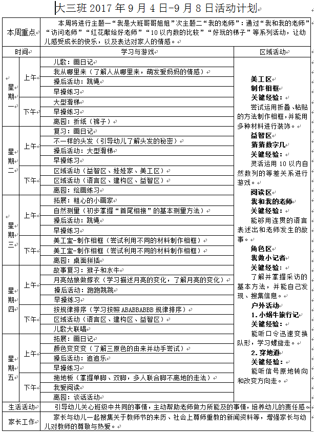 大三班2017年9月4日-9月8日活动计划