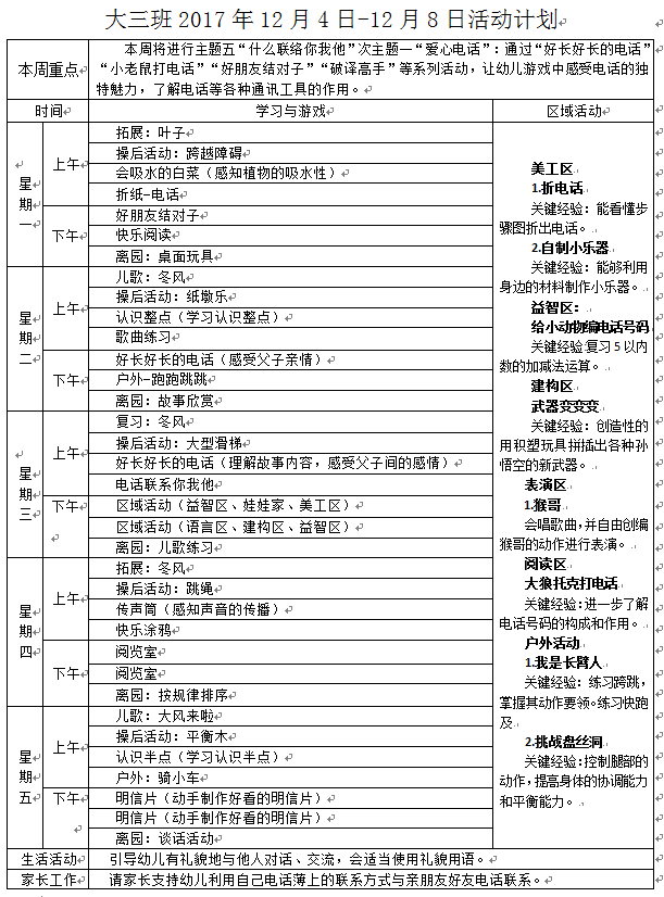 大三班2017年12月4日-12月8日活动计划