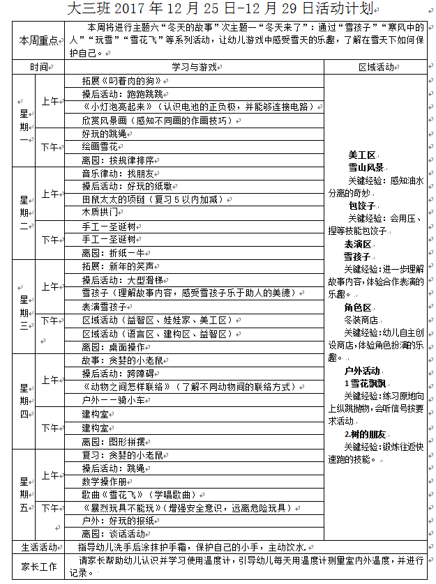 大三班2017年12月25日-12月29日活动计划