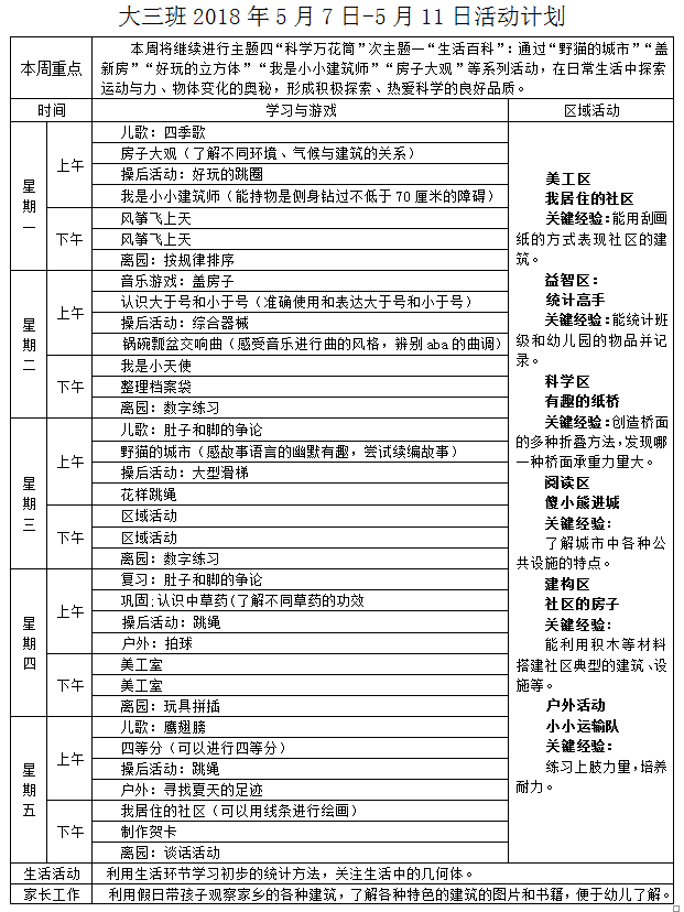 大三班2018.5.7-2018.5.11活动计划