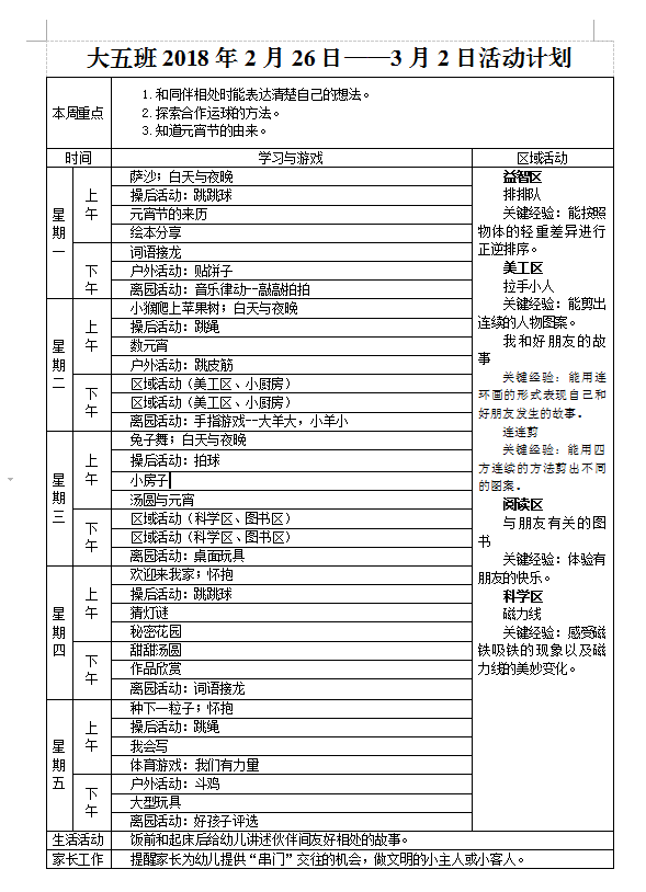 大五班2018年2月26日——3月2日活动计划