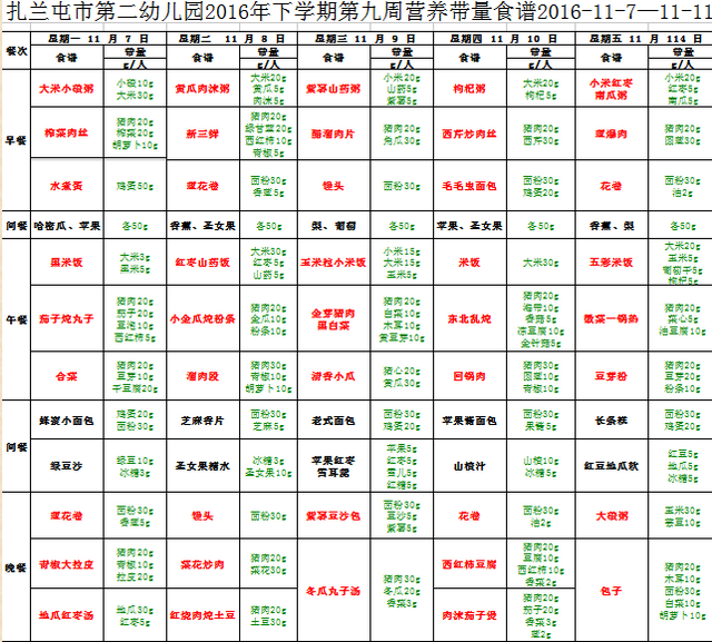 扎兰屯市第二幼儿园2016年下学期第九周营养带量食谱2016-11-7—11-11