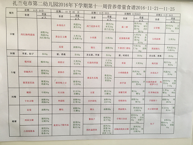 扎兰屯市第二幼儿园2016年下学期第十一周营养带量食谱2016-11-21---11-25
