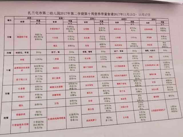 扎兰屯市第二幼儿园2017年第二学期第十周营养带量食谱2017年11月9日- 11月13日