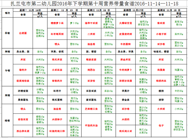 第十周营养带量食谱