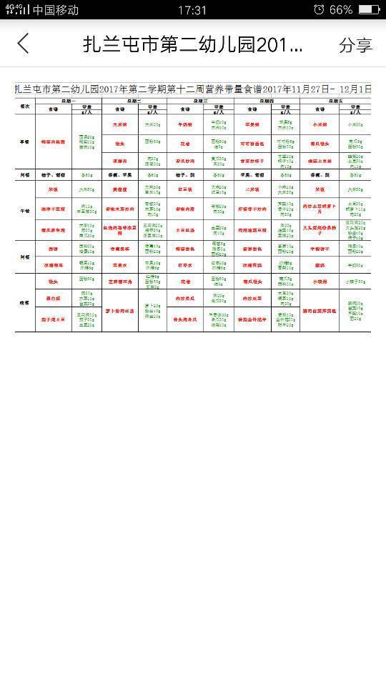 扎兰屯市第十二周营养带量食谱