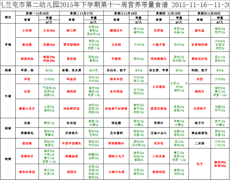 扎兰屯市第二幼儿园2015年下学期第十一周营养带量食谱