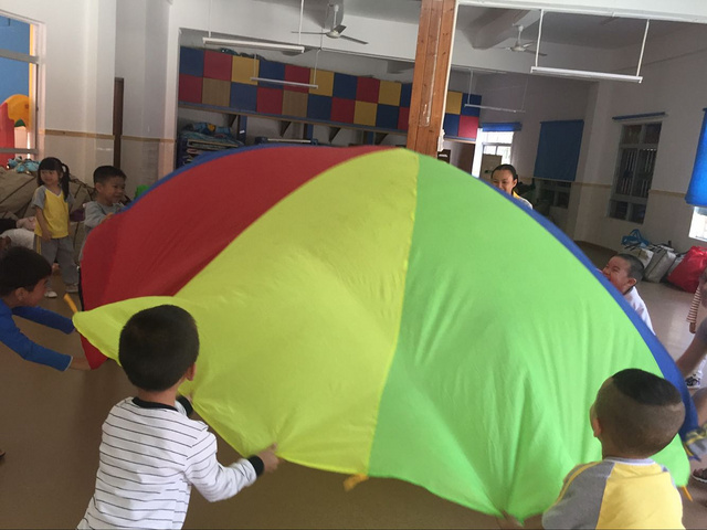 伞是我们日常生活中不可缺少的物品,小小的伞可以为我们遮太阳,可以让我们避风雨。。。。在“伞花朵朵开”主题里,我们带领孩子观察五花八门的伞,探索伞的特性,联想各种伞的事物,探索有趣的伞。今天我们准备和孩子们一起来玩彩虹伞。