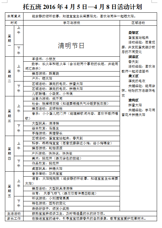 托五班2016年4月5日—4月8日活动计划