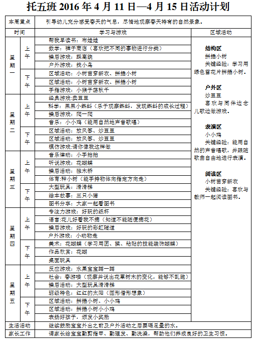 托五班2016年4月11日—4月15活动计划