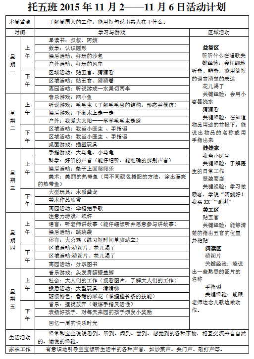 托五班2015年11月2日—11月6日活动计划