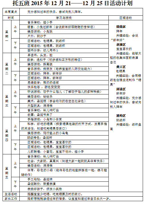 托五班2015年12月21日—12月25日活动计划
