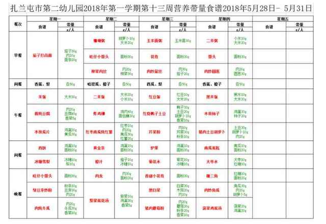 第二幼儿园第十三周营养食谱