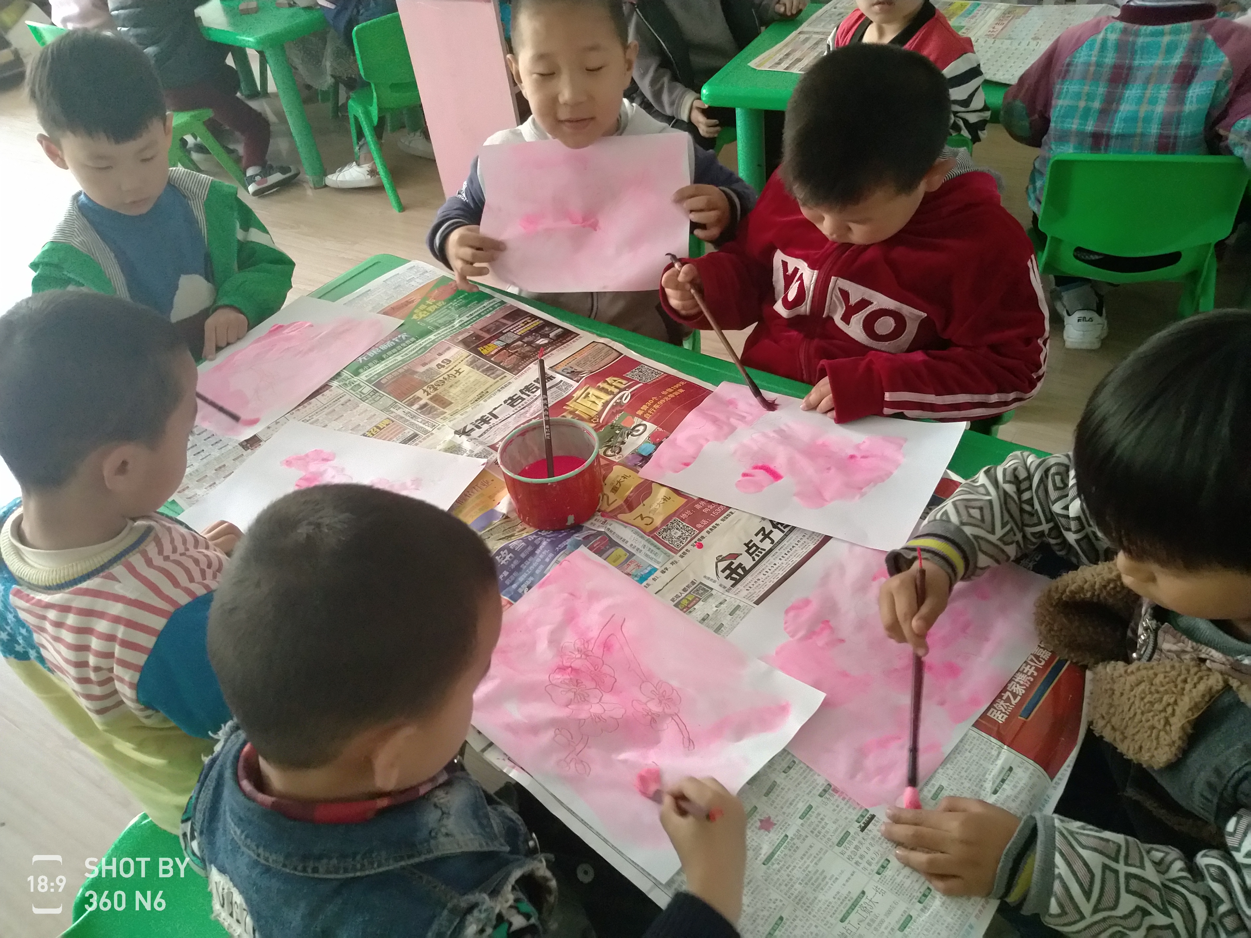 孩子们在学习油水分离法画桃花