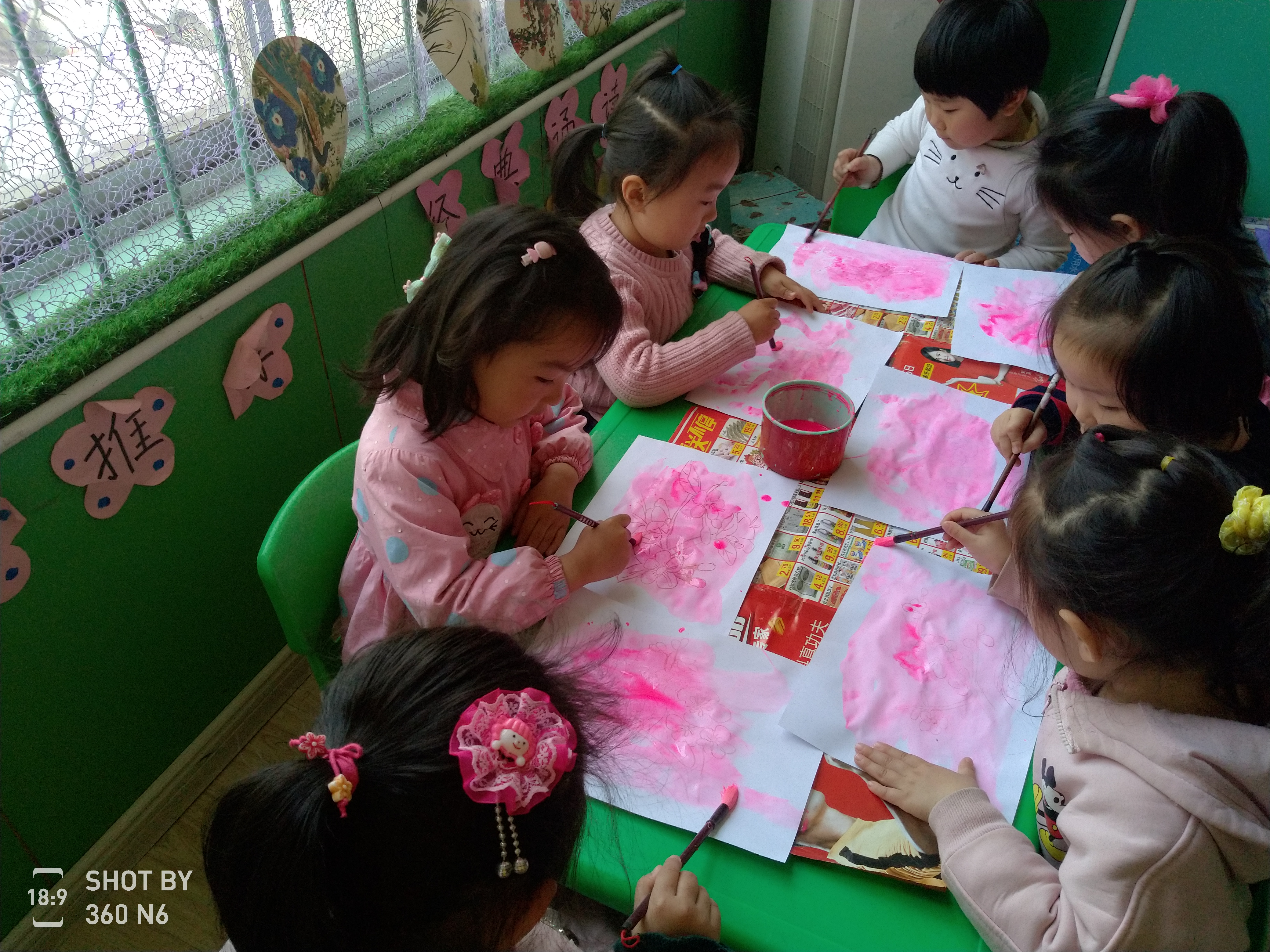 孩子们在学习油水分离法画桃花