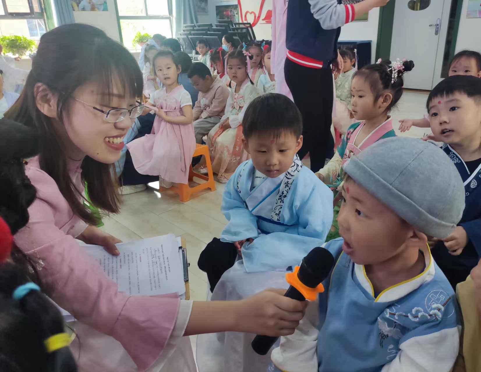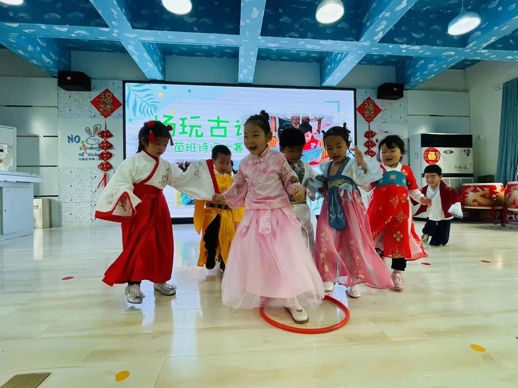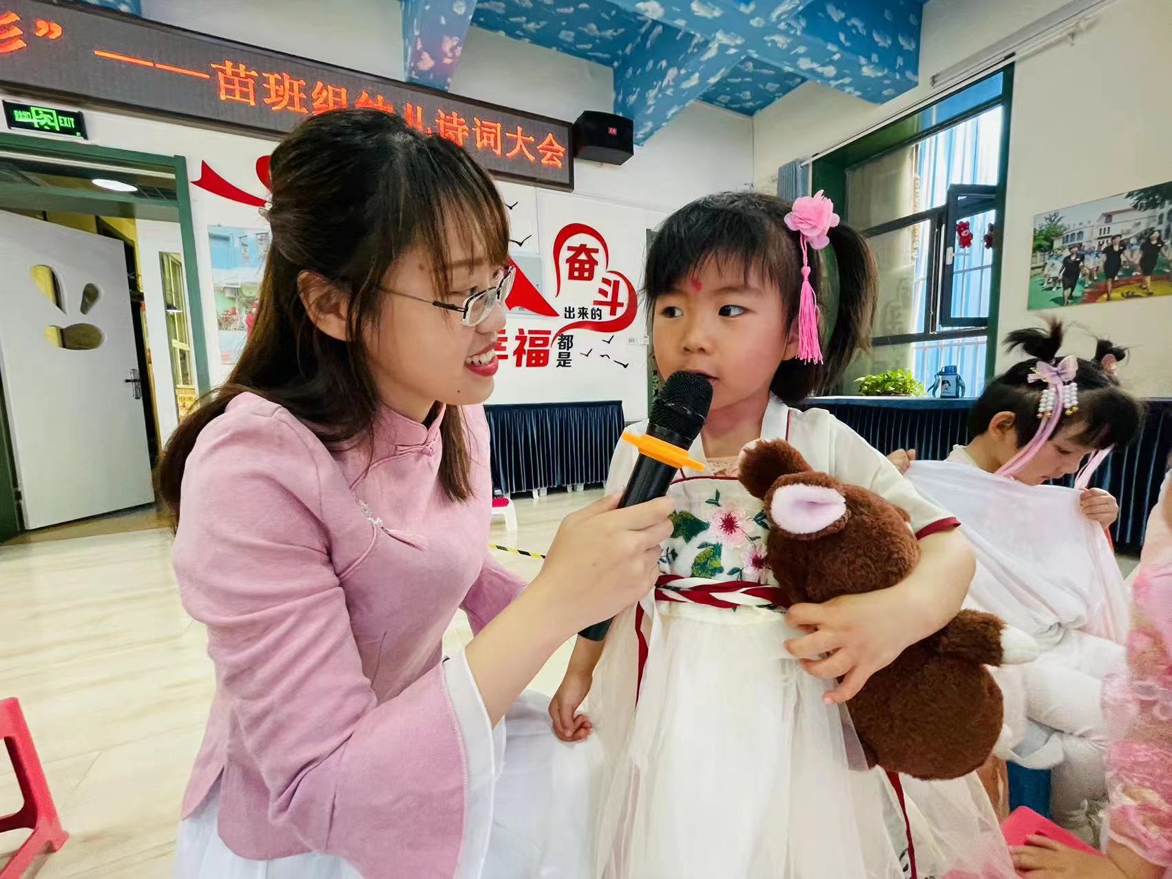 中华诗词是历史长河中颗颗明珠,在文学艺术的星空中熠熠生辉,它是民族文化的根基和典范,代代传诵,千古不衰。为了让幼儿体验诗词的优美,传承古诗词文化,石家庄市第二幼儿园第七届阅读节以“诗传古韵、阅见春天”为主题,带领孩子们一起重温那些历久弥新的经典诗句,赴一场诗词之旅。 在幼儿园的多功能厅,小班举办了的诗词大会。孩子们身着汉服,在一首首吟唱千古的唐诗宋词中认识了李白、王维、骆宾王;在你来我往的对诗中感受中国古典诗词深邃优美的意境;伴着欢快悠扬的音乐,将经典的古诗词进行表演传唱。击鼓传花、诗词接龙……紧张而有趣的游戏将活动推向高潮。