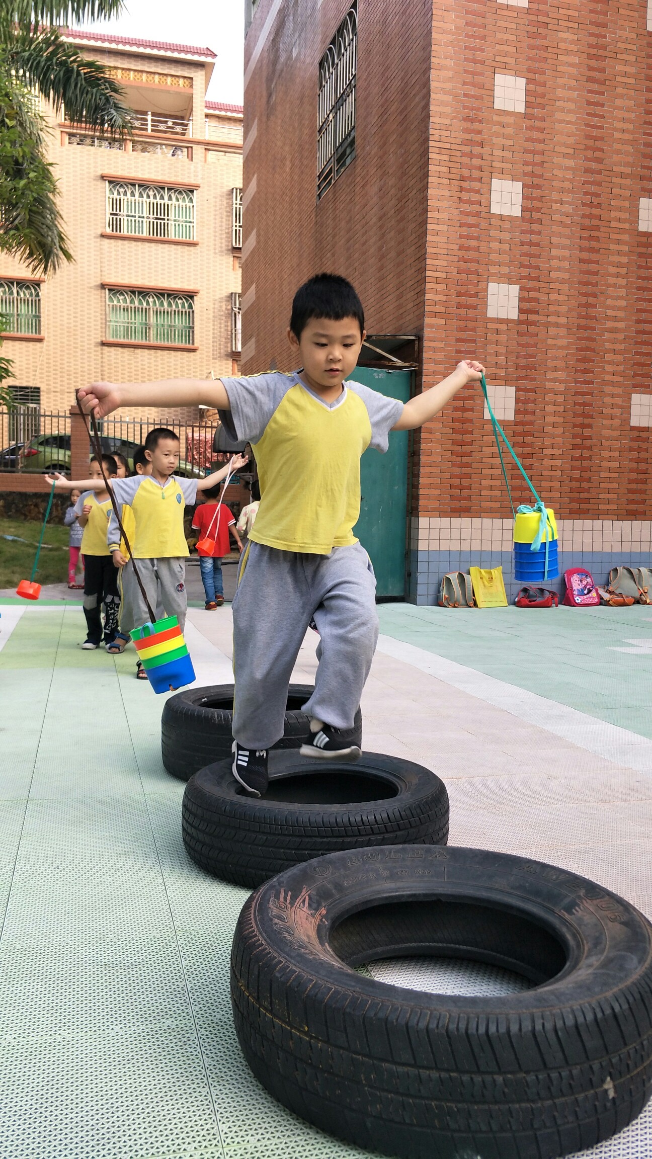 让孩子们打开双臂提着高跷,可