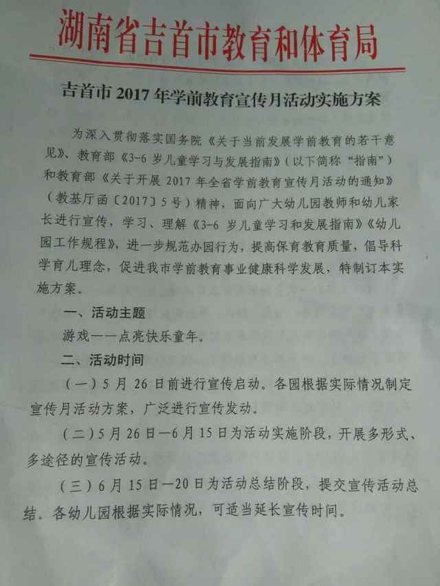 为深入贯彻落实教育部《3—6岁儿童学习与发展指南》、吉首市教育和体育局《关于开展2017年学前教育宣传月活动实施方案的通知》等文件精神,促进我市学前教育事业科学发展。吉首市阳光幼儿园已经开展学前教育宣传月活动。