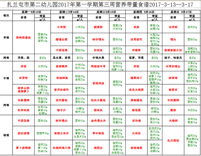 扎兰屯市第二幼儿园2017年第一学期第三周营养带量食谱2017-3-13—3-17