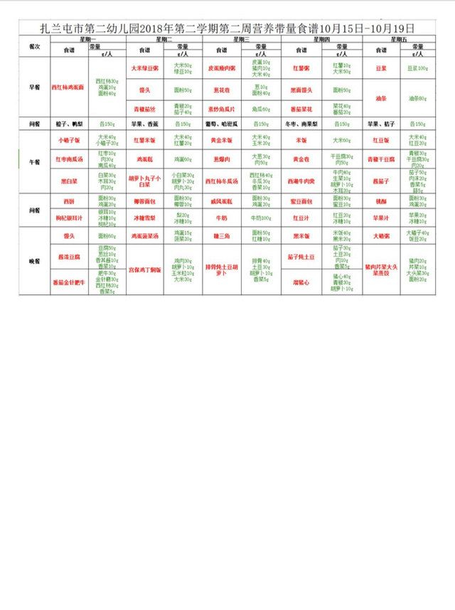 第二幼儿园2018年第二学期第二周带量食谱
