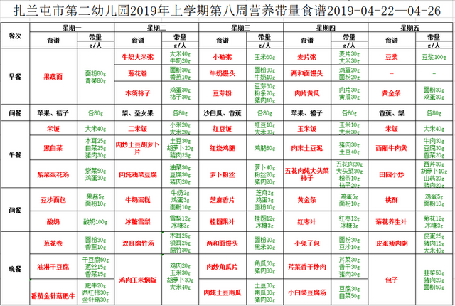第二幼儿园2019年上学期第八周营养带量食谱2019-04-22—04-26
