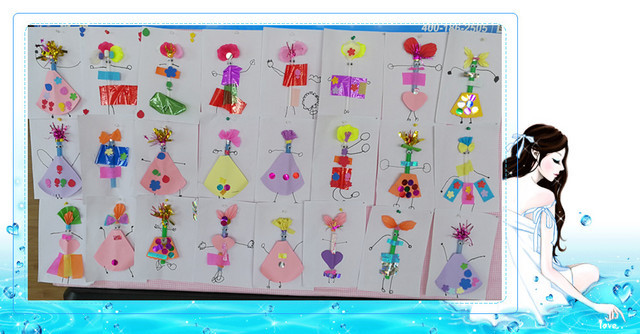 今天我们用吸管制作了一个吸管娃娃,并且还运用亮片、彩纸、皱纹纸、小花、彩带等材料为吸管娃娃设计衣服呢。衣服设计好后,还添画了四肢,表现了娃娃的不同造型。