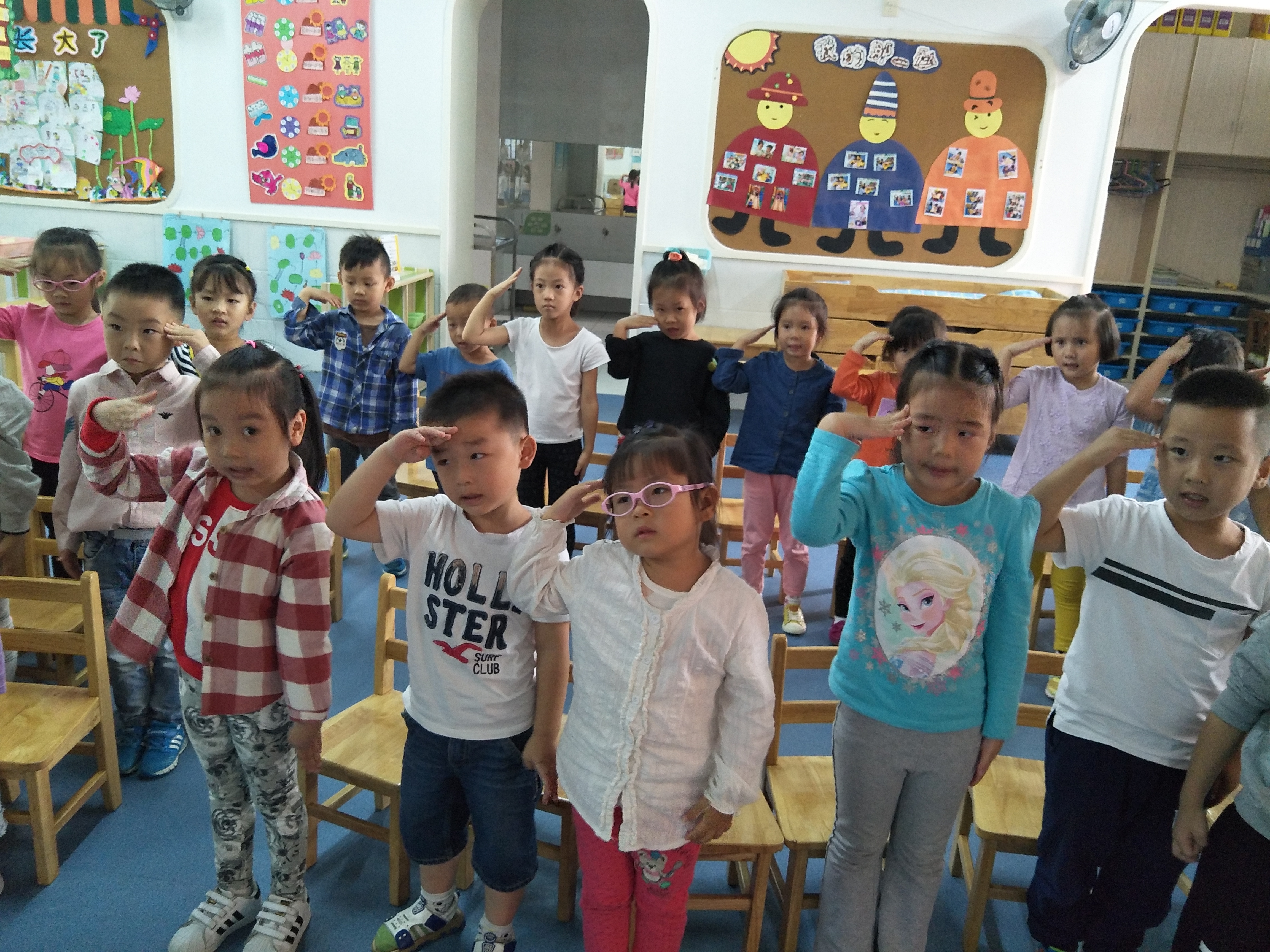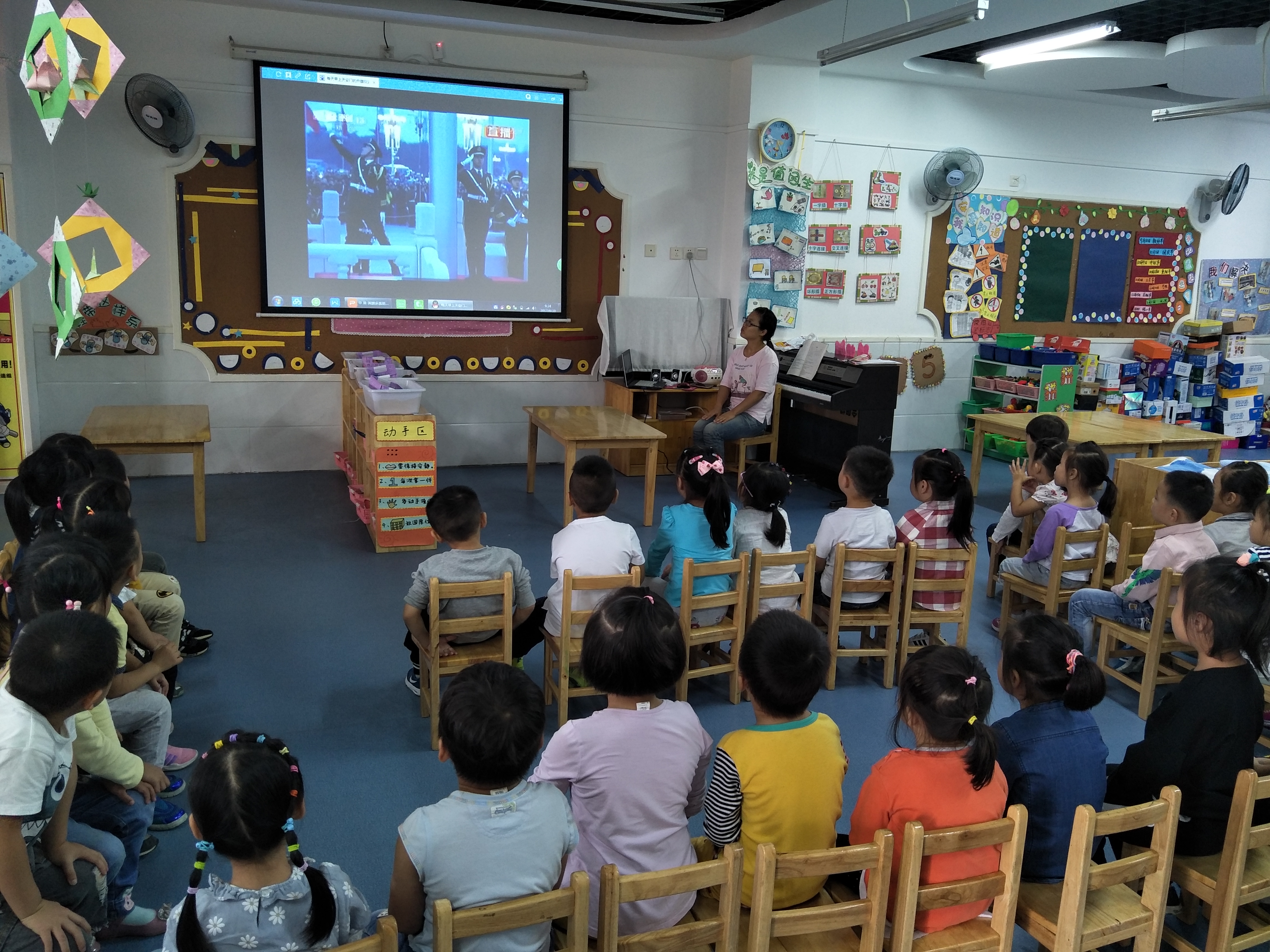 今天我们开展了音乐活动《国旗多美丽》,通过欣赏天安门解放军升旗的视频,让幼儿了解了我们的国歌,了解了升旗的仪式。然后欣赏了歌曲《国旗多美丽》,增进孩子们热爱祖国,爱护国旗的情感。