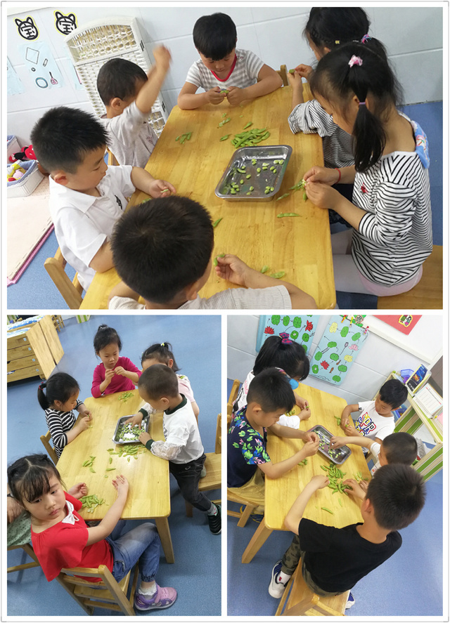 活动中,有的小组在一边剥一边数数,有的小组在比赛谁剥的快,还有的小组在边剥边观察豆子的大小,一会的功夫就剥出一大盘毛豆,别提有多开心了。通过这次的剥毛豆活动,孩子们不仅观察了毛豆的外形特征,掌握了剥豆技能,还锻炼了手指的灵敏性,更增强了他们爱劳动的兴趣,活动结束后许多小朋友自豪的说:“回家也要帮忙剥豆子”。