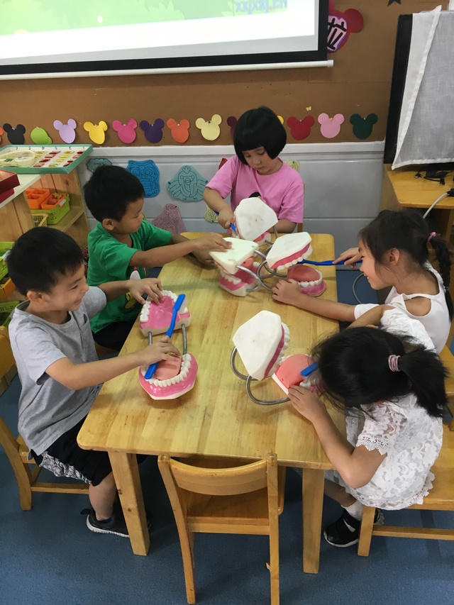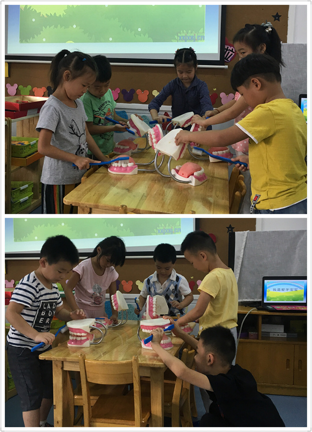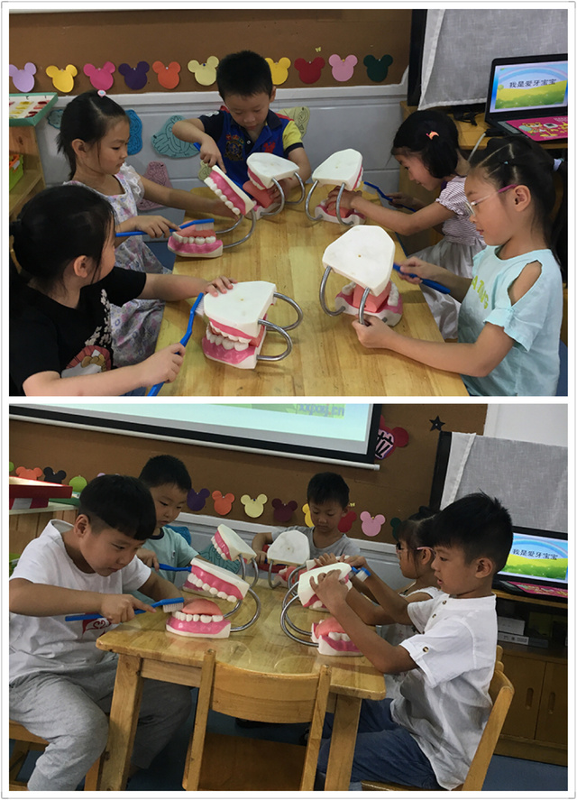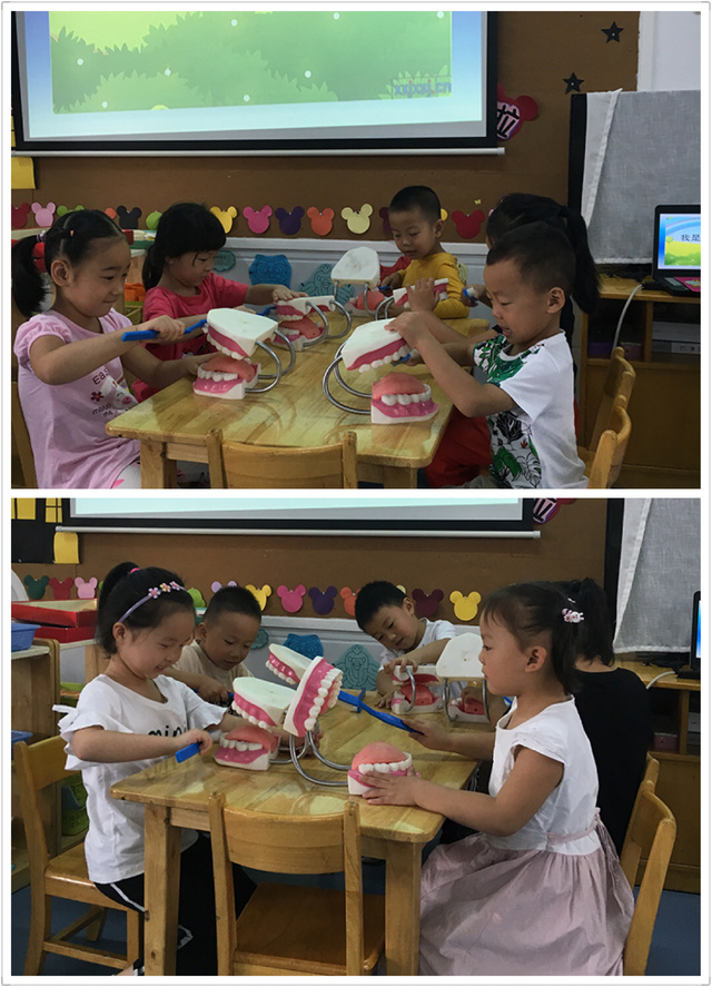 最后老师教了小朋友们一首刷牙儿歌:小牙刷,手中拿,每天早晚要刷牙。上牙往下刷,下牙往上刷,咬合面来回刷。坚持刷牙和漱口,我有一口小白牙。幼儿纷纷动手一边拿起牙刷去刷牙齿模型,一边说着儿歌,忙的不亦乐乎。