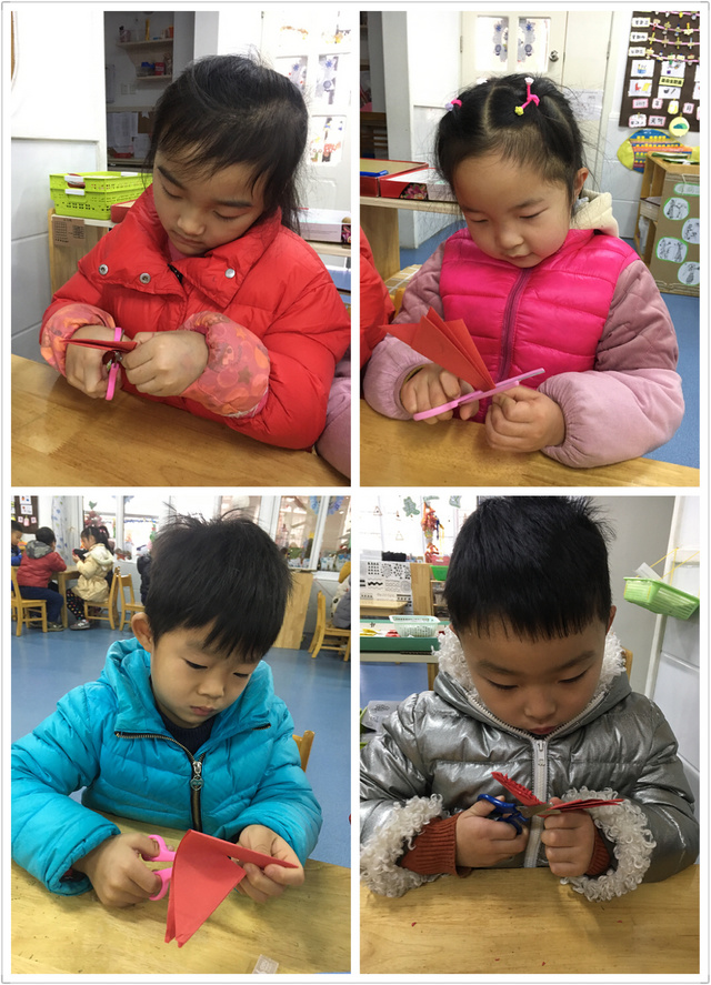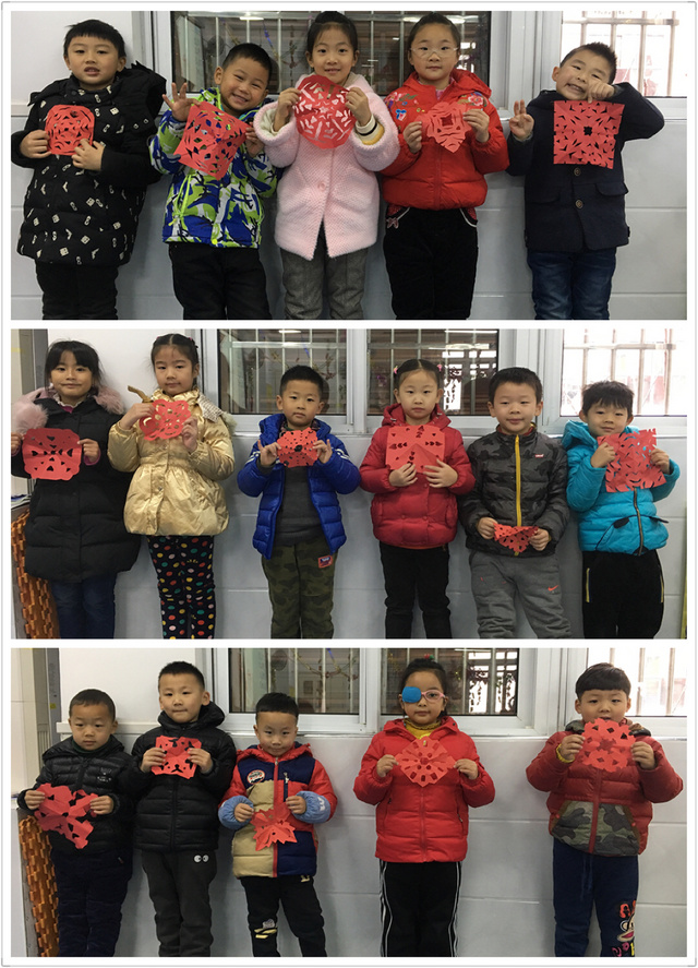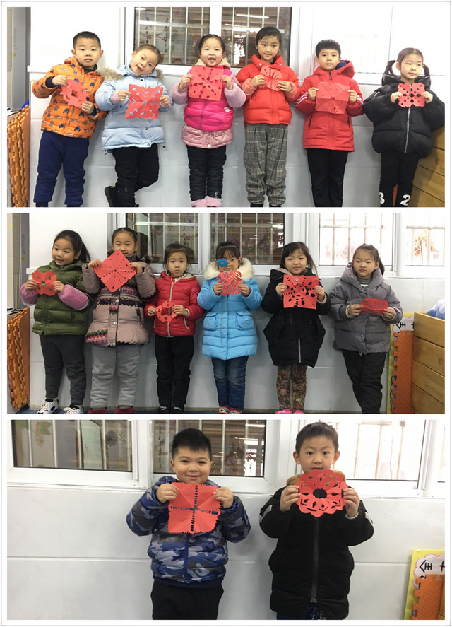 本周我们班开展了剪窗花的活动,活动中幼儿积极参与,兴趣浓厚,整个活动场面热烈、温馨、其乐融融。在老师的指导下,孩子们用灵巧的小手剪出了造型各异、形象逼真、色彩艳丽的窗花。有雪花、有五角星、有小手绢、有爱心......一幅幅精致的作品洋溢着欢乐祥和的迎春气息。