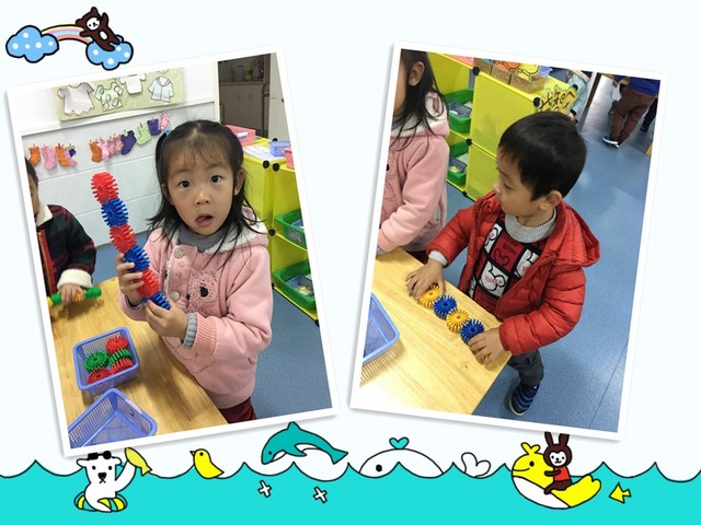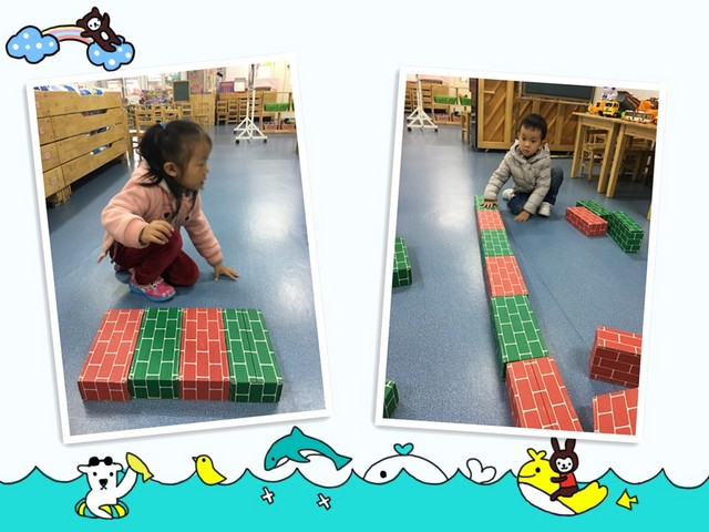 我还会用玩具用一个颜色和另一个颜色间隔着拼搭起来呢。
