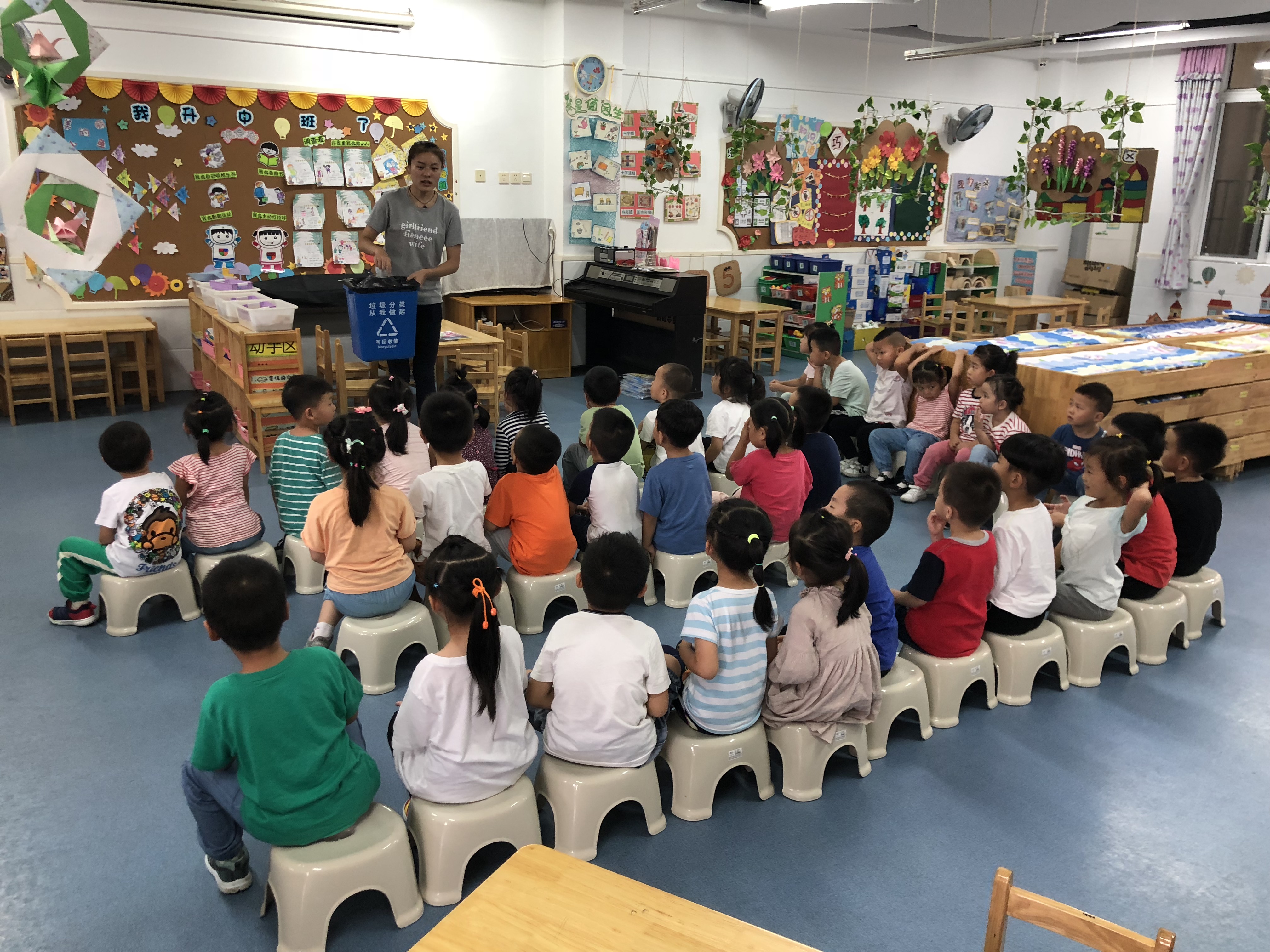 我们在班上向小朋友们详细介绍了垃圾分类的标志,如可回收垃圾、不可回收垃圾、厨余垃圾等,垃圾的品种以及如何进行垃圾分类。我们也组织小朋友们去观察垃圾分类桶,仔细讲解垃圾桶上的回收标志,垃圾的品种。小朋友们积极思考,踊跃回答,增长了知识。