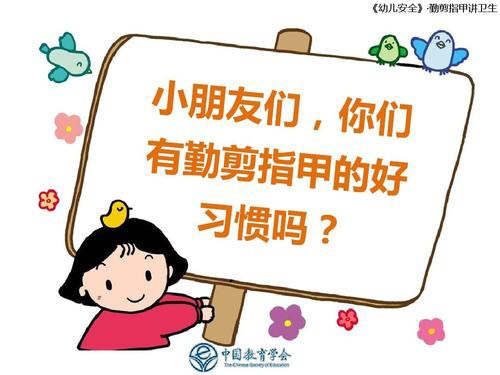 根据孩子们的回答最后小结出:小朋友有吸吮手指和用手直接拿东西吃的习惯,手指甲缝里的脏东西吸进嘴里后,往往会引起消化道疾病和寄生虫病。因为长指甲中不仅隐藏着许多小小的细菌,危害健康,而且很容易划伤他人。小朋友们一定要定期剪指甲,养成卫生好习惯。