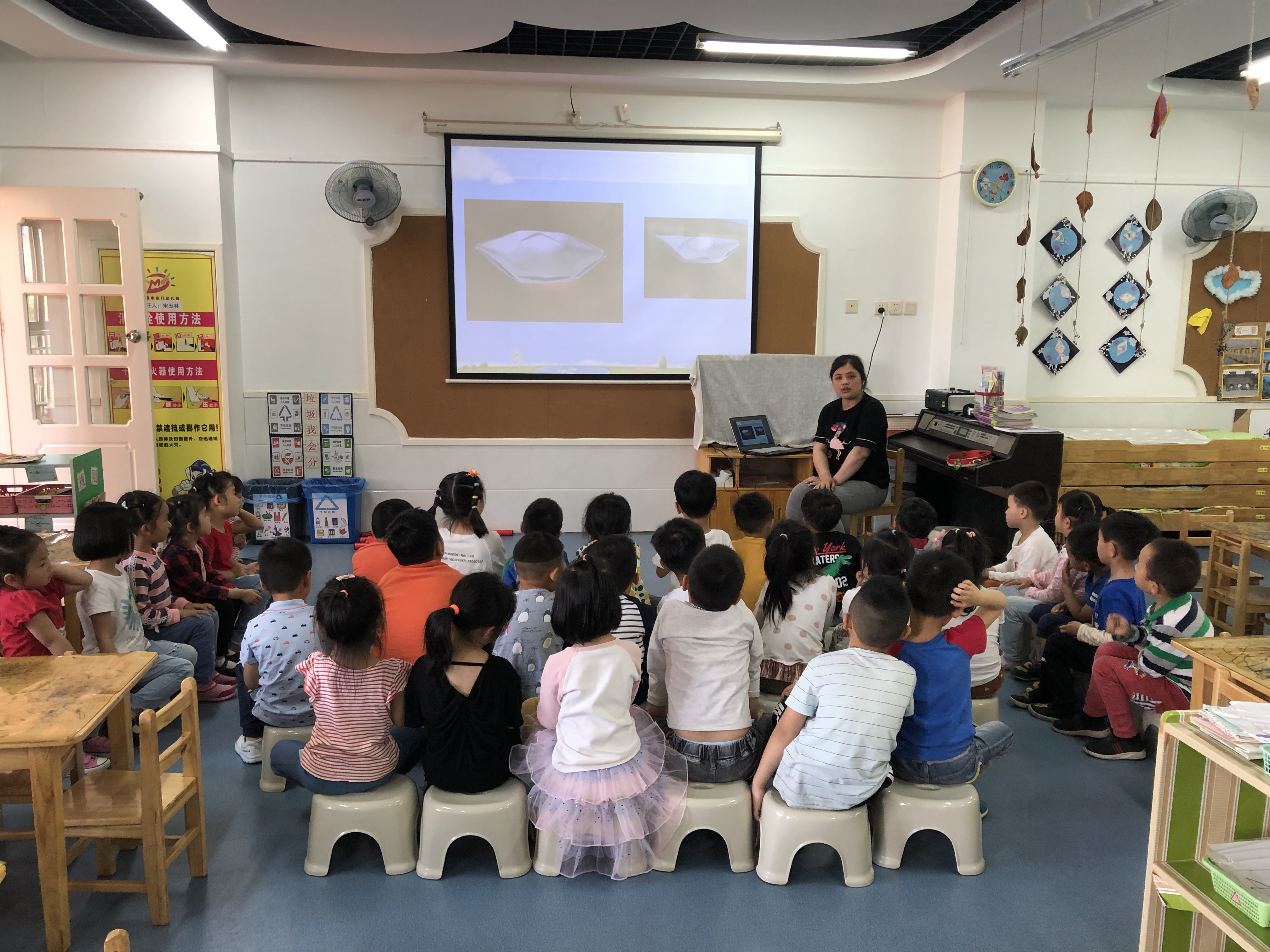 这周我们学习了折纸龙舟哦!在开始我们从一首童谣《小白船》开始,孩子们立刻进入到了美妙的小白船音乐中。