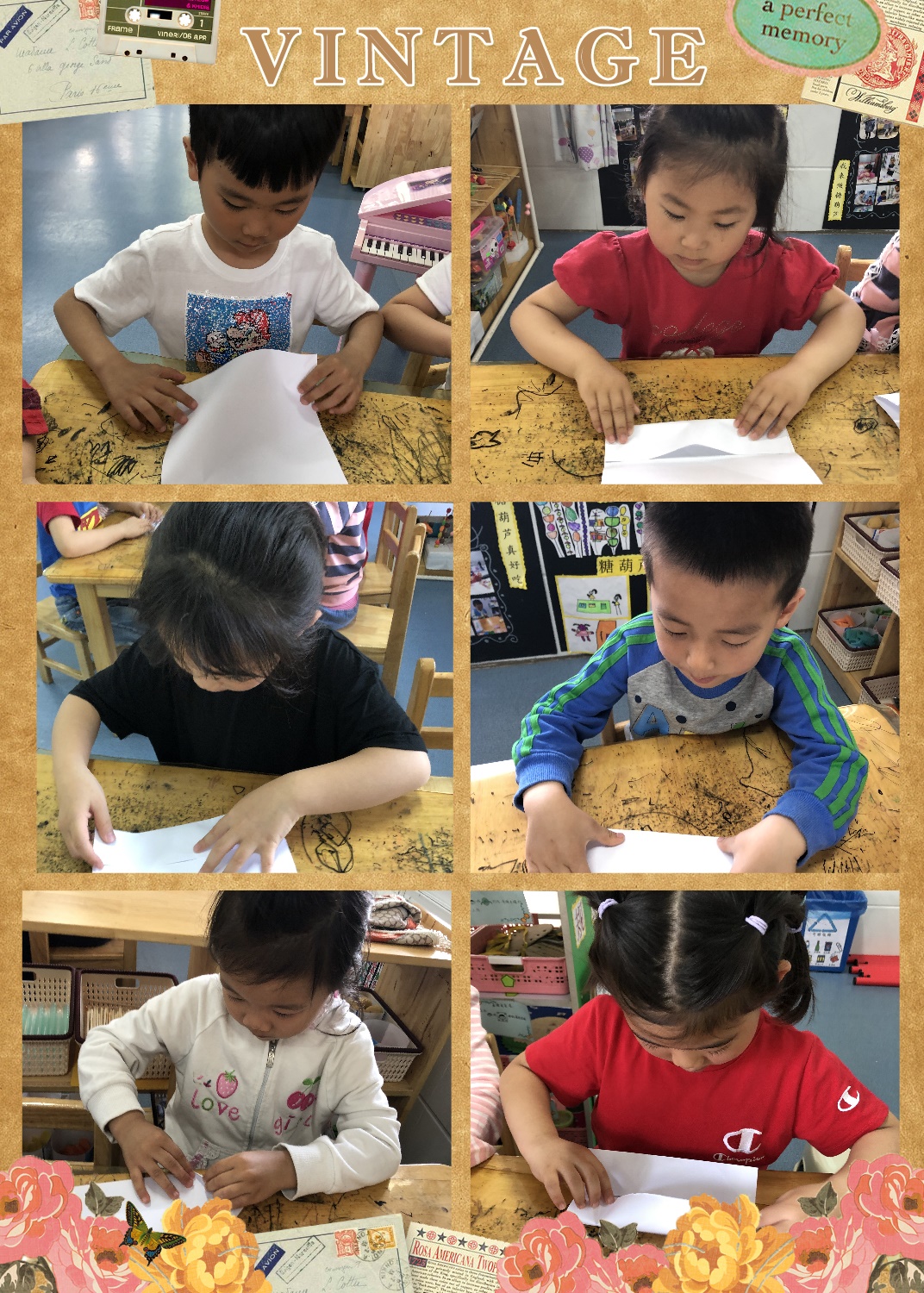 当出现了折纸示意图后孩子们也能够积极地说一说小船每一步不同的折纸步骤。接着孩子们也自己试了试!快来看看我们折得多认真啊!