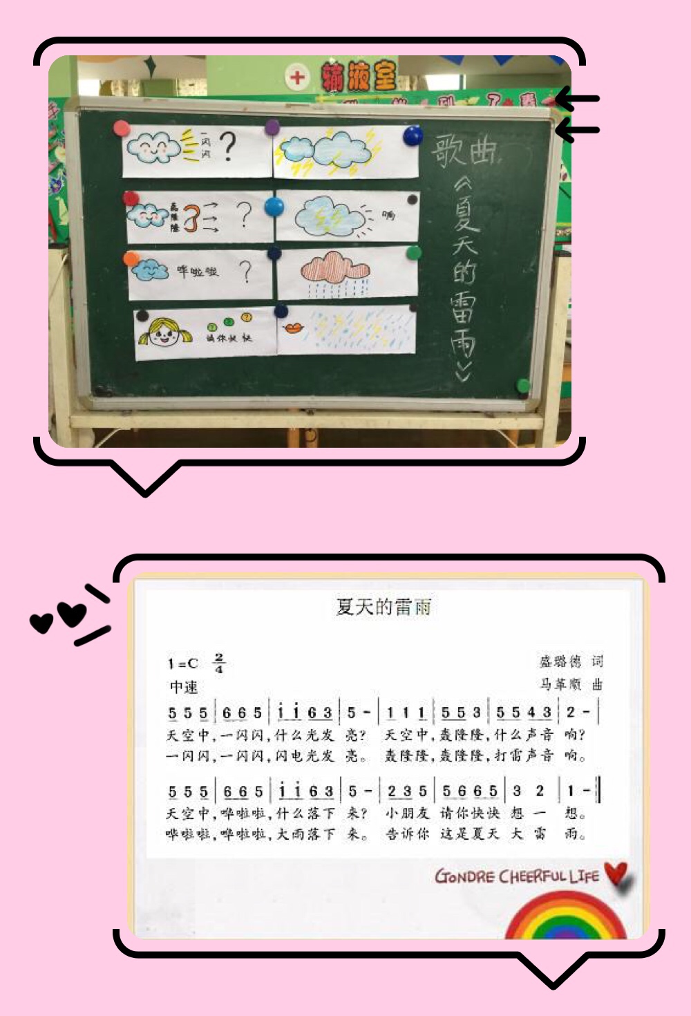 活动前,我首先对本首歌曲进行了一个整体的分析:歌曲一共为两段,第一段为问,第二段是答;歌曲内容主要围绕“夏天的雷雨”展开;在歌曲中有一个节奏难点为切分音节奏。