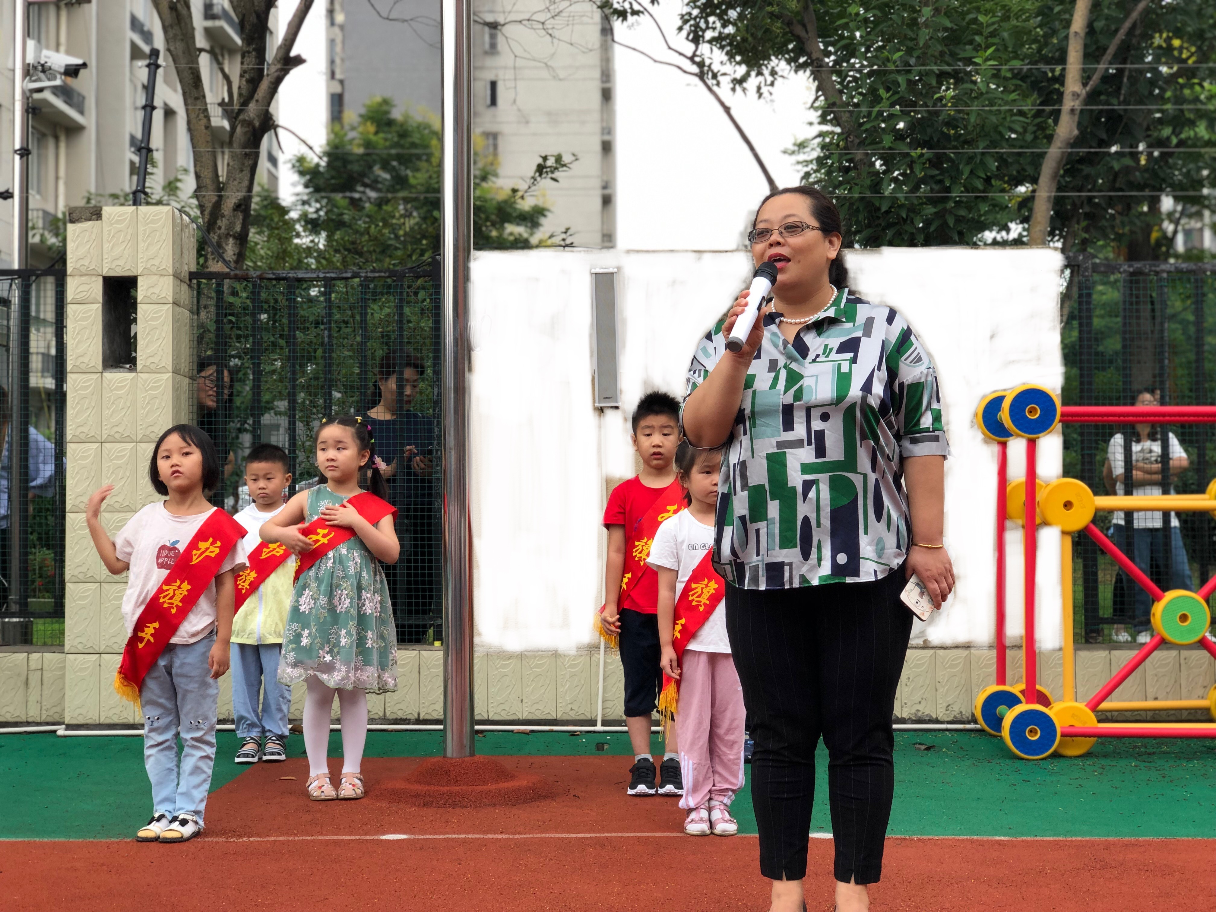 每周一的升旗仪式,我们一个个站得像小士兵一样。开学第一天国旗下讲话,我们的园长妈妈给我们的孩子送上了祝福并且还送上了五个宝贝:健康、快乐、成长、礼貌、安全。在这里我们要牢记园长妈妈送的宝贝。