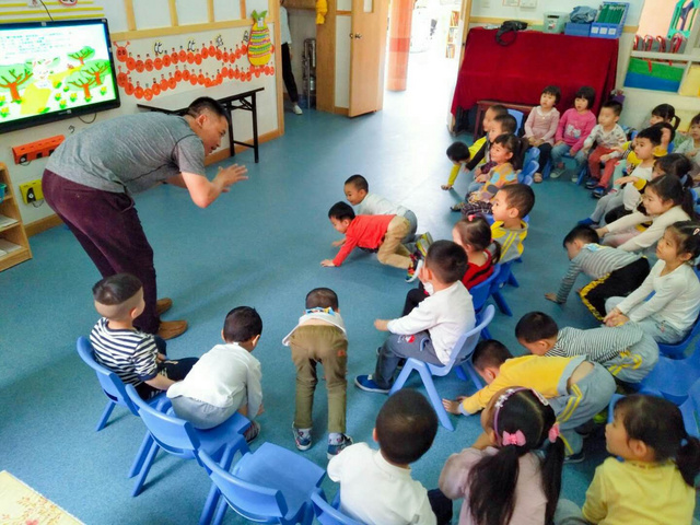 在讲故事的过程中,跟小朋友的互动也很多,这是在引导他们学乌龟爬呢。