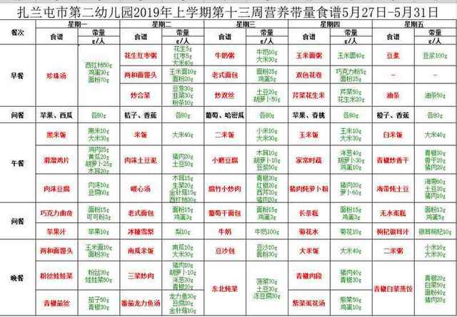 2019中班第二学期第十三周食谱