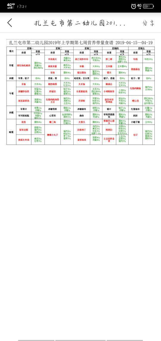 2019年第七周营养食谱