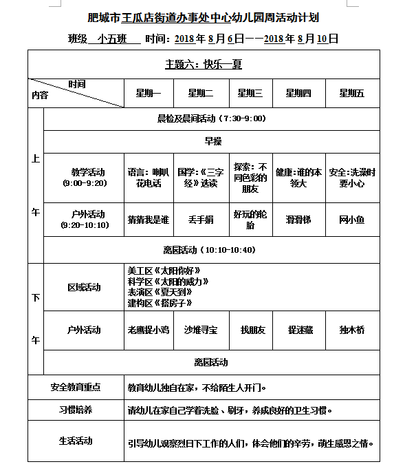 肥城市王瓜店街道办事处中心幼儿园周活动计划