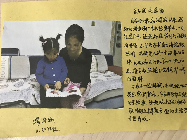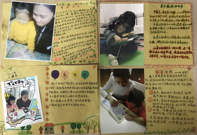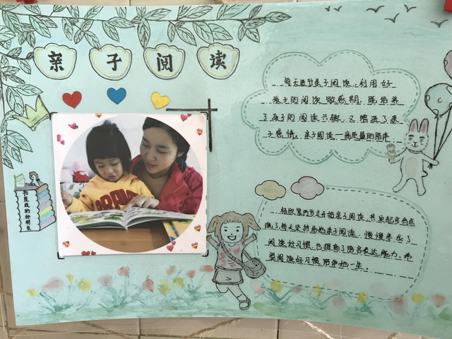 亲子篇 我们每位家长为孩子们准备了精装绘本带到班级,这样班级图书漂流是流动的图书馆,老师不断更换图书家长和孩子可以随时借阅、归还。有的家长和孩子共同自制绘本阅读倡议书,瞧!爸爸、妈妈和孩子们通过剪、贴、画等不同方式共同制作都是全球限量版哦!在制作的过程中体会不一样的阅读的快乐,有的妈妈还说仿佛回到了童年的时光,是啊,在教育孩子、引导孩子的过程中我们要拥有一颗童心,才能走进孩子们精彩的世界。 家长是孩子的镜子,孩子是家长的影子。让你的行动带动孩子,孩子阅读的时候家长可以多给予他们更多的耐心、鼓励孩子们多观察画面、和孩子谈谈书里的故事内容,久而久之,升华了亲子关系,提高了孩子的审美能力、注意力与观察力,拓宽了孩子的视野。亲子阅读好处多多,让我们共同用绘本陪伴孩子健康成长。