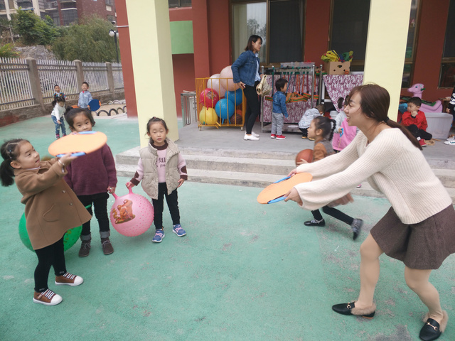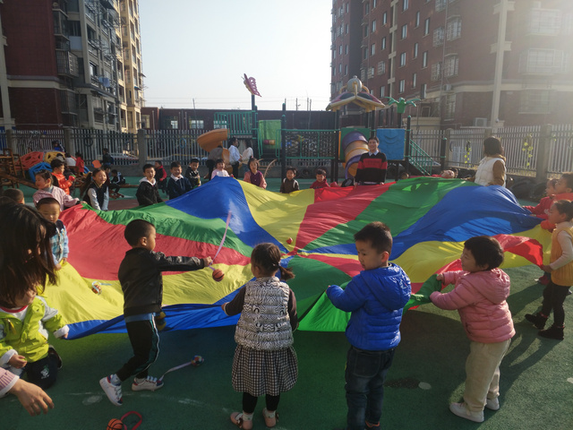 户外混龄篇 日期:2018年11月9日 记录人:郑子舟 内容: 彩虹伞+ 各班级小型户外体育游戏器械 目标: 1、培养幼儿的谦让意识,在集体活动中学会等待。 2、结合大带小晨间活动的开展,促进混龄幼儿之间的情感。 准备:户外操场,各班级自主游戏材料 游戏场景再现: 爱玩是我们小朋友们的天性,丰富多彩的户外活动更是我们健康成长的源泉。幼儿园拥有宽敞的活动场地,样式新颖、多种多样的玩具,每天操场上都呈现出一片热闹景象,我们有的玩轮胎、有的玩独木桥、还有滑滑梯……,玩得不亦乐乎,尽情享受着大自然的新鲜空气,在自由快乐中锻炼身体茁壮成长。今天,我们的孩子用彩虹伞玩起了“蛋炒饭”,一会加佐料,一会加菜,一会翻炒,一会又变成荷包蛋,孩子们尽情的玩着,一片欢声笑语。 幼儿每天有充足的游戏活动时间,让孩子能在丰富多彩的活动中,得到健康快乐的发展。同时教师们以饱满的热情,将各种玩具创新的组合成各种有趣的运动,充分满足了孩子们活动锻炼的需要,幼儿园里随处可以看见孩子们游戏的身影,他们快乐的笑声在幼儿园的上空回旋。 反思与调整: 在游戏中进行指导时,教师十分注意对游戏过程的观察。孩子喜欢重复的做同一件事情,并从中获得生活体验与认知。但由于幼儿的年龄特点较小,,并没有很好的自制能力与规则性,导致活动中期出现一些违反规则的不安全隐患,这时就需要教师适当的提醒幼儿,活动中,教师可不断强调幼儿安全。