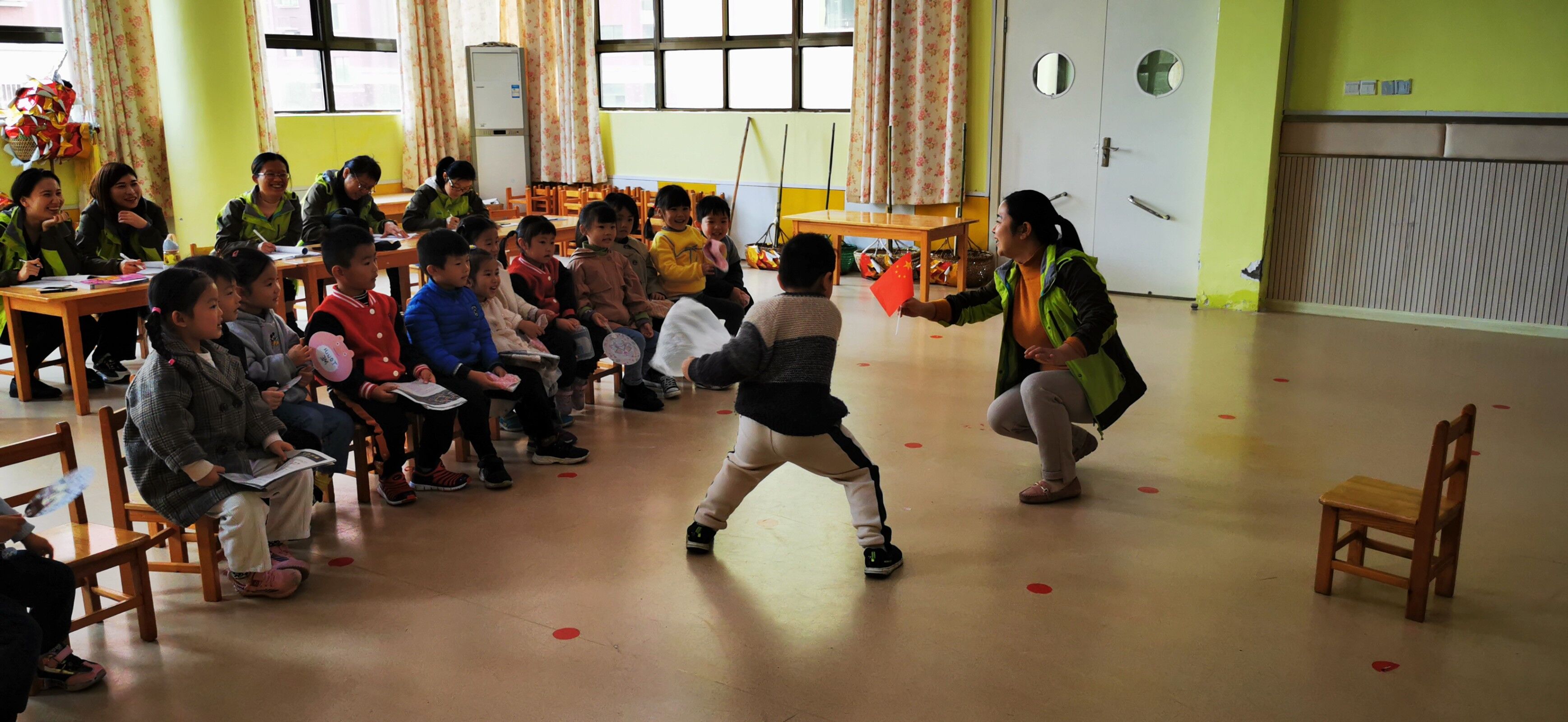 活动目标: 1、让幼儿了解风向及风与人们生活的关系,知道风对人的利与弊。 2、激发幼儿对风的好奇心,并喜欢探索风的秘密。 3、在用各种感官感受风的变化的同时,培养幼儿动手动脑探究问题的能力。 活动准备: 小旗1面、一条彩旗、塑料袋、纸盒、报纸、扇子、毛巾、布条、大箱子 活动过程: 一、发现风 (1)谈话导入 师:今天张老师给你们带来了一件礼物你们猜猜是什么?(小红旗) (2)教师出示小旗子,请幼儿想办法让小旗子动起来(要求:请幼儿在不碰到小旗子的基础上让小旗子动起来),个别幼儿上来展示。 小结:原来我们身体动一动就会带动空气的流动,形成风 二、制造风 (1)师:今天张老师为小朋友们准备了很多材料,请你们试试那些材料可以制造出风。 教师请幼儿玩塑料袋、纸盒、报纸、扇子、毛巾、布袋、布条等,感受风的存在,请个别幼儿说说自己手上拿到的材料是什么,展示造出风,让小旗子动起来。 小结:任何东西只要动一动都可以形成风。 (2)教师拉起一条彩旗,让所有幼儿都来用自己手上的材料来造出风,使彩旗动起来 三、感受风的大小 师:老师还给每位小朋友准备了一个礼物(垫板),请你们领完后回到小椅子上试试,能用它造出风来吗?我们一起来试试(能) 教师通过口令风大了、风小了、风停了引导幼儿制造风风大小。 小结:(1)造出大风,要用很大的力气:造出小风,用很小的力气 (2)造出大风,手抖动的速度要快:造出小风,手抖动的速度要慢 四、认识风的方向 (1)师:小朋友们真能干,能指挥风了。那你们能让风往后面吹吗?(幼儿操作纸板)能向张老师吹吗?(幼儿操作纸板)那找一个你喜欢的地方把风吹过去(幼儿操作纸板) (2)师:刚刚你是把风吹向哪儿的?(个别幼儿回答) 总结:原来风是有方向的。 (3)教师出示小纸盒,请个别幼儿展示,根据教师提示,用纸板造出风,使纸盒往指示的方向移动 小结:风有移动物品的本领 (4)比赛:两名幼儿面对面,小纸盒放中间,两面各画一条界线,比赛者听到口令开始往相对方向造风,看看谁能快速吹到对方的界线外,速度快者赢 五、结束部分: 师:风本领很大,风可以帮我们晒干衣服、可以发电、带来凉爽,请小朋友回去多多了解风还有哪些本领,下次来和我们一起分享交流。 活动反思:风作为一种自然现象,平时不太被幼而所关注,为了让幼儿能够了解风,激发幼儿的好奇心,本此活动,无论是语言还是材料,我都为孩子们提供了一个轻松的氛围。以“玩风”为切入点,幼儿在探索、尝试的过程中初步了解风的形成,培养幼儿对自然科学的兴趣。在学习过程中幼儿的参与度很高,接受的也很快,积极的探索,但是在总结性的问题上幼儿语言组织不到位,应当给幼儿留有足够的思考空间。