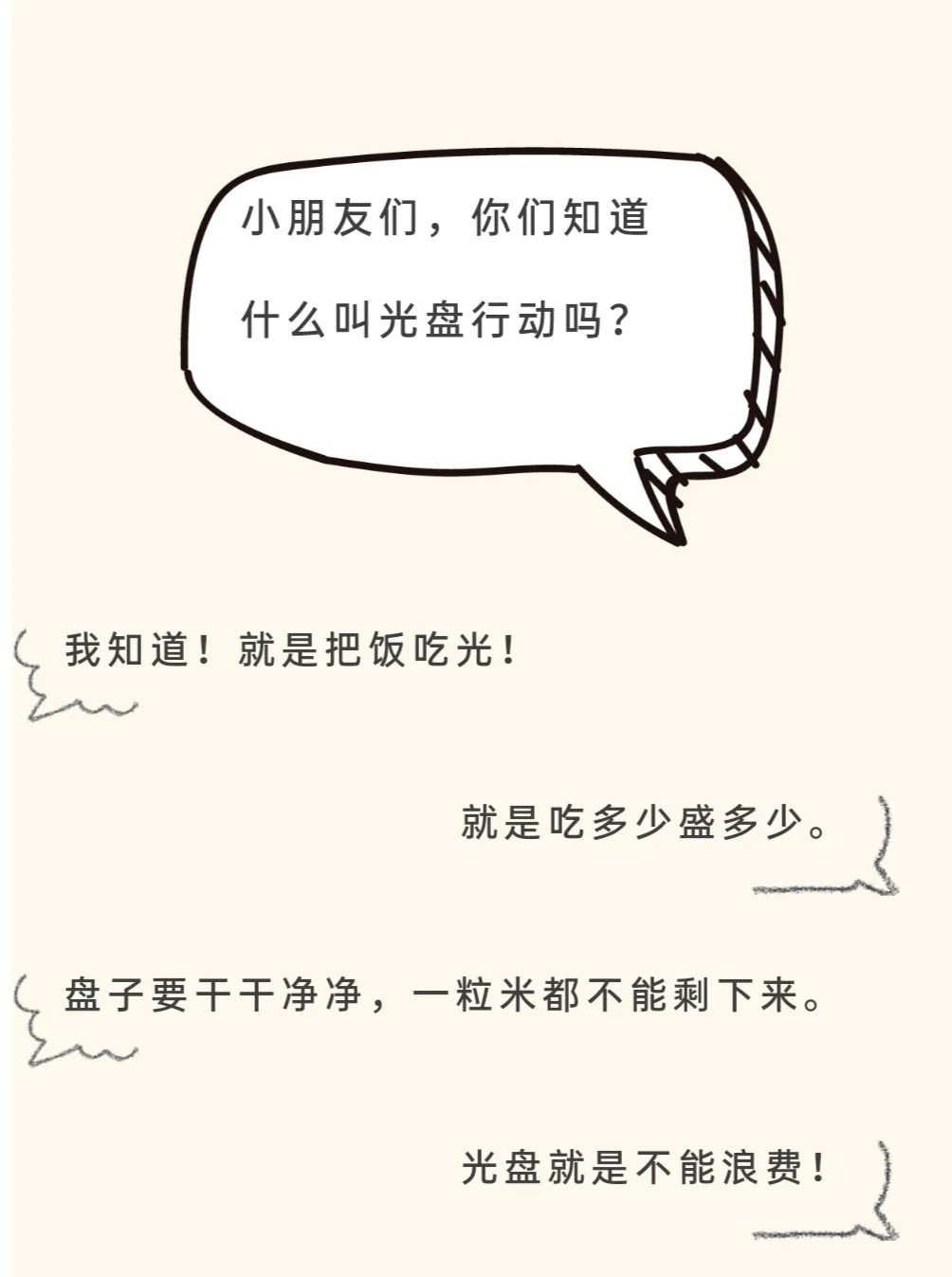 光盘行动,从我做起 有一种节约叫“光盘” 随着生活条件越来越好,餐桌上浪费的粮食也越来越多,“舌尖上的浪费”触目惊心,身边的浪费比比皆是。小小的你,是否能做些什么?小小的你,如果每天光盘,能把食物分享给多少饥饿的人?让我们行动起来,对“舌尖上的浪费”说“NO”!"一粥一饭当思来之不易,半丝半缕恒念物力维艰。"勤俭节约是中华民族的传统美德,随着“光盘”这个词的流行,越来越多的人都纷纷投入到“光盘行动”中来。我班开展了“光盘行动 从我做起”主题教育活动。号召幼儿以“吃光自己盘中的饭菜”的实际行动践行节约精神,培养幼儿爱惜粮食、同时也知道粮食来之不易,并用行动告诉大家,提倡节约,拒绝浪费,从小养成勤俭节约的良好品质。 一、专题教育,树立意识 为了让幼儿懂得每一粒粮食的得来不易,让幼儿形成节约的意识,老师们通过多种活动教育号召幼儿以“吃光自己盘中的饭菜”的实际行动践行节约精神,培养幼儿爱惜粮食、勤俭节约的良好品质。