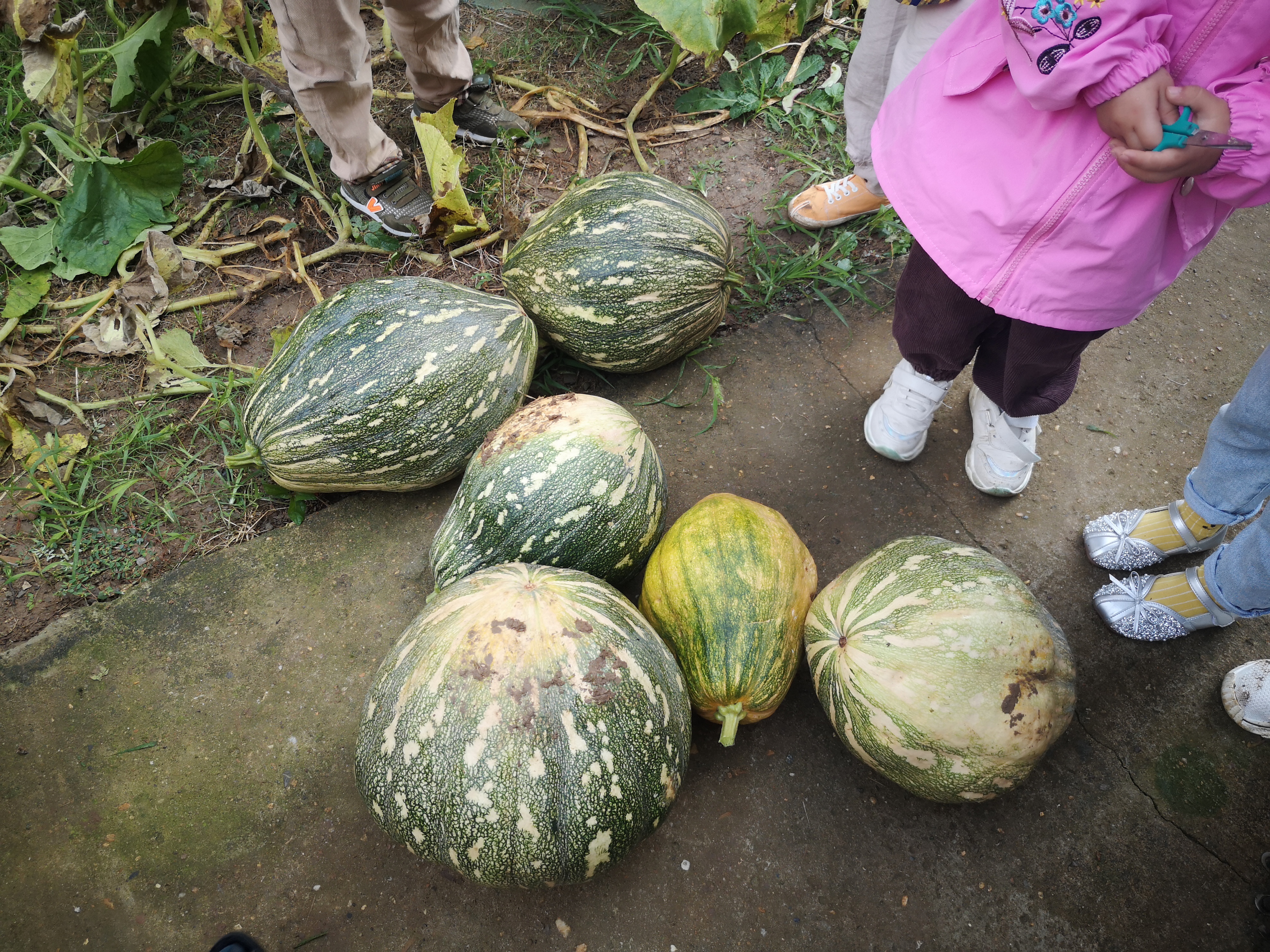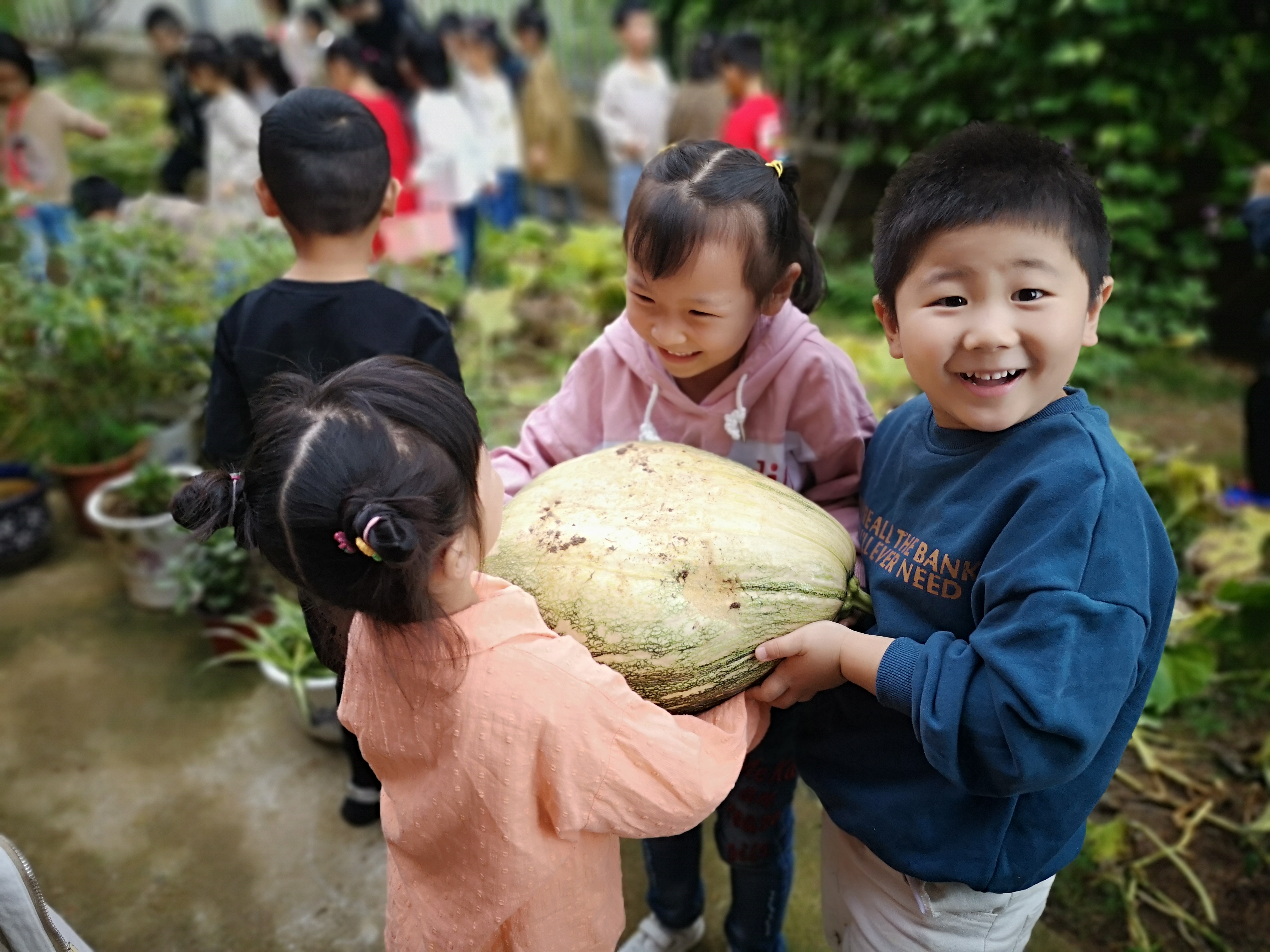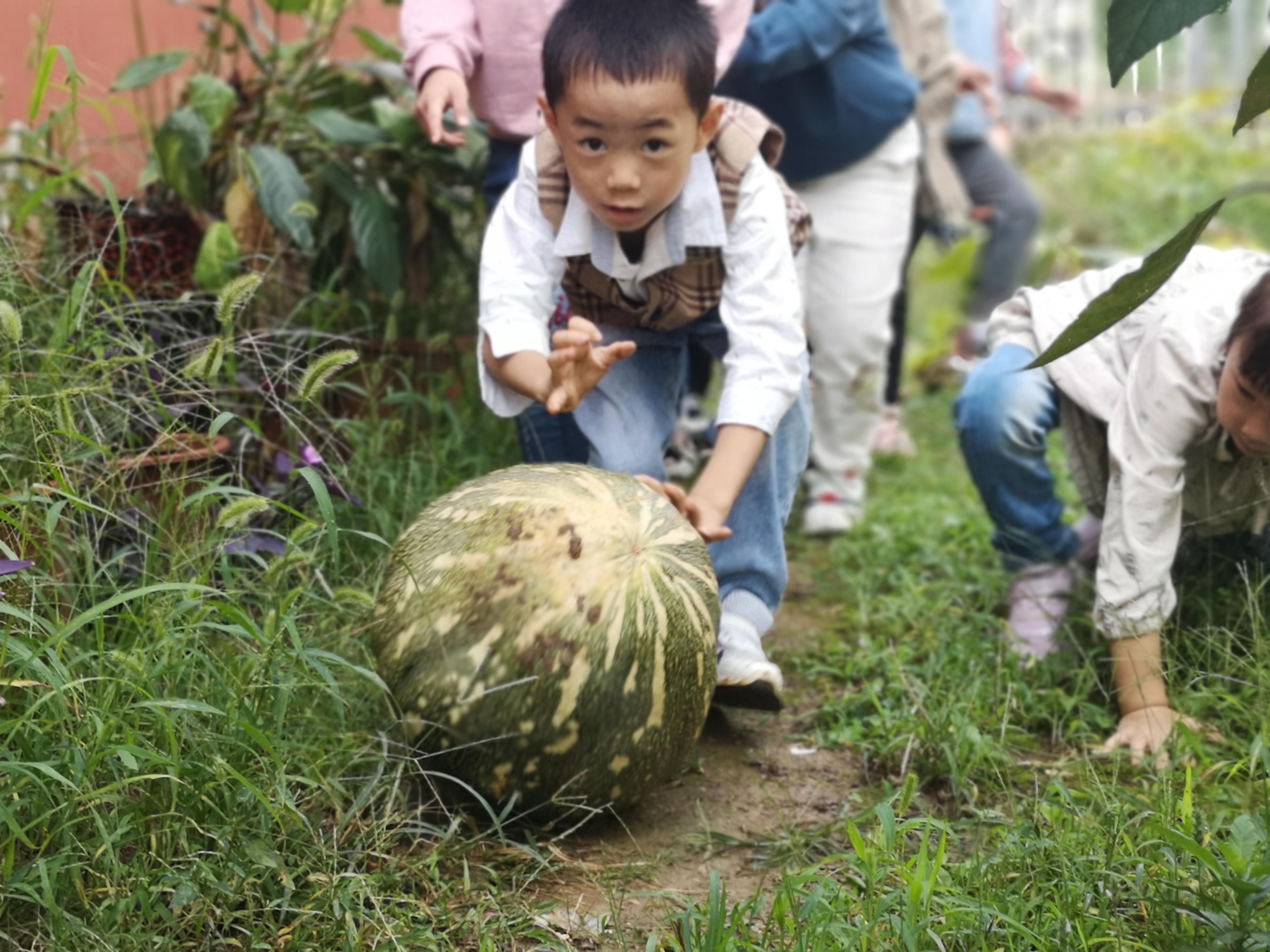 有一个特别大的南瓜被林溪和小朋友发现了,大家一起围观来看南瓜,有一个小朋友用了好大的力气都没有搬动,他们商量了一会决定几个人抬着走,过了一会又发现一个大南瓜,这时我们班的飞飞小朋友说我可以把滚着走,得到了所有小朋友的认可,大家都拍手叫好。