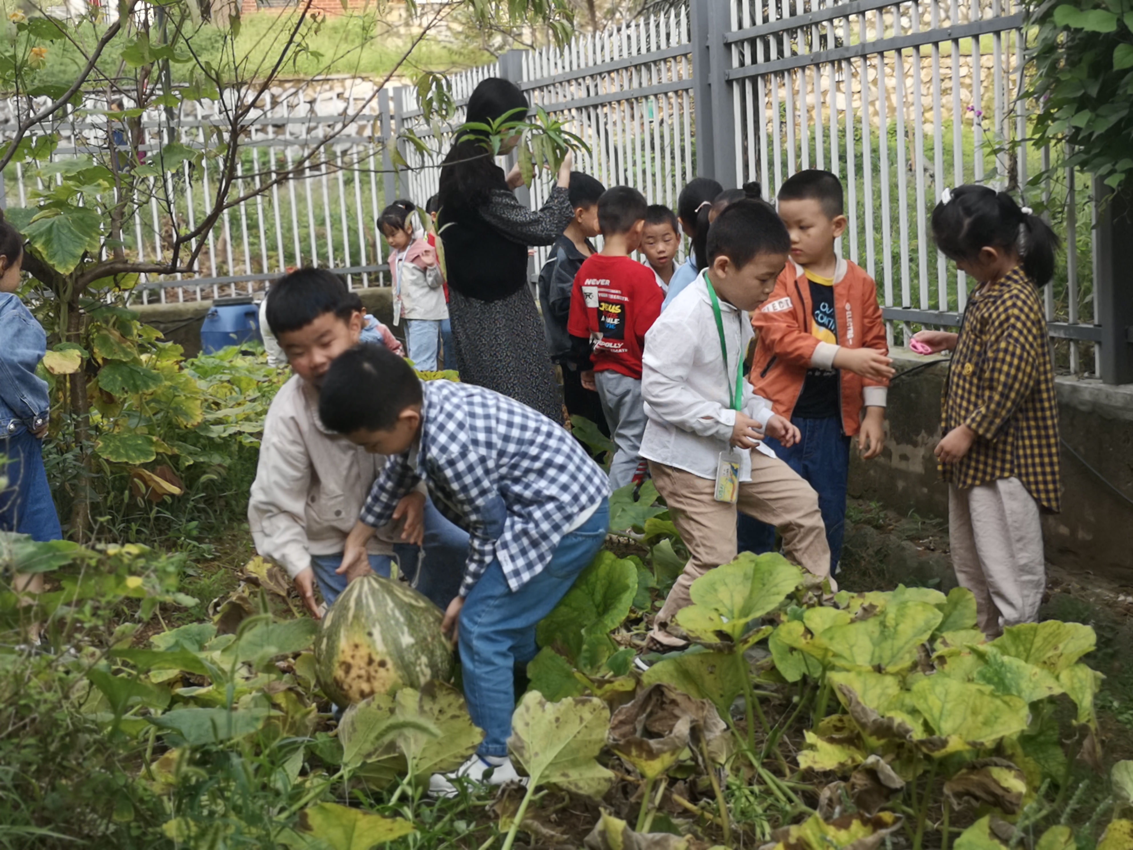 “南瓜”奇遇记 师:“秋天有哪些变化?” 林:“树叶掉落了。” 宋:“树叶变黄了。” 金:“小动物们开始储存食物了。” 马:“秋天是丰收的季节。” 任:“秋天有好多好吃的水果。” 章:“秋天穿毛衣。” 幼儿园种植活动的核心价值是满足孩子们亲近大自然的需要,增进其对植物的情感。近日种植园地里,孩子们正高兴地收获自己种植的南瓜,为了让孩子们观察了解种植的每一个步骤,感知植物的生长过程,老师们将种植活动纳入日常的教学活动之中。在每次的种植园管理时间,孩子们都会带着水桶、铲子和锄头,松土、除草、浇水、期盼着快快长大……在大家的细心照顾下,今年春天播种的南瓜,终于迎来了丰收的一刻。瞧,孩子们有的负责采摘、有的负责装袋子,有的负责扛,还有的指挥其他孩子:“那个大,那个大,一起来帮忙。”个个忙的不亦乐乎。