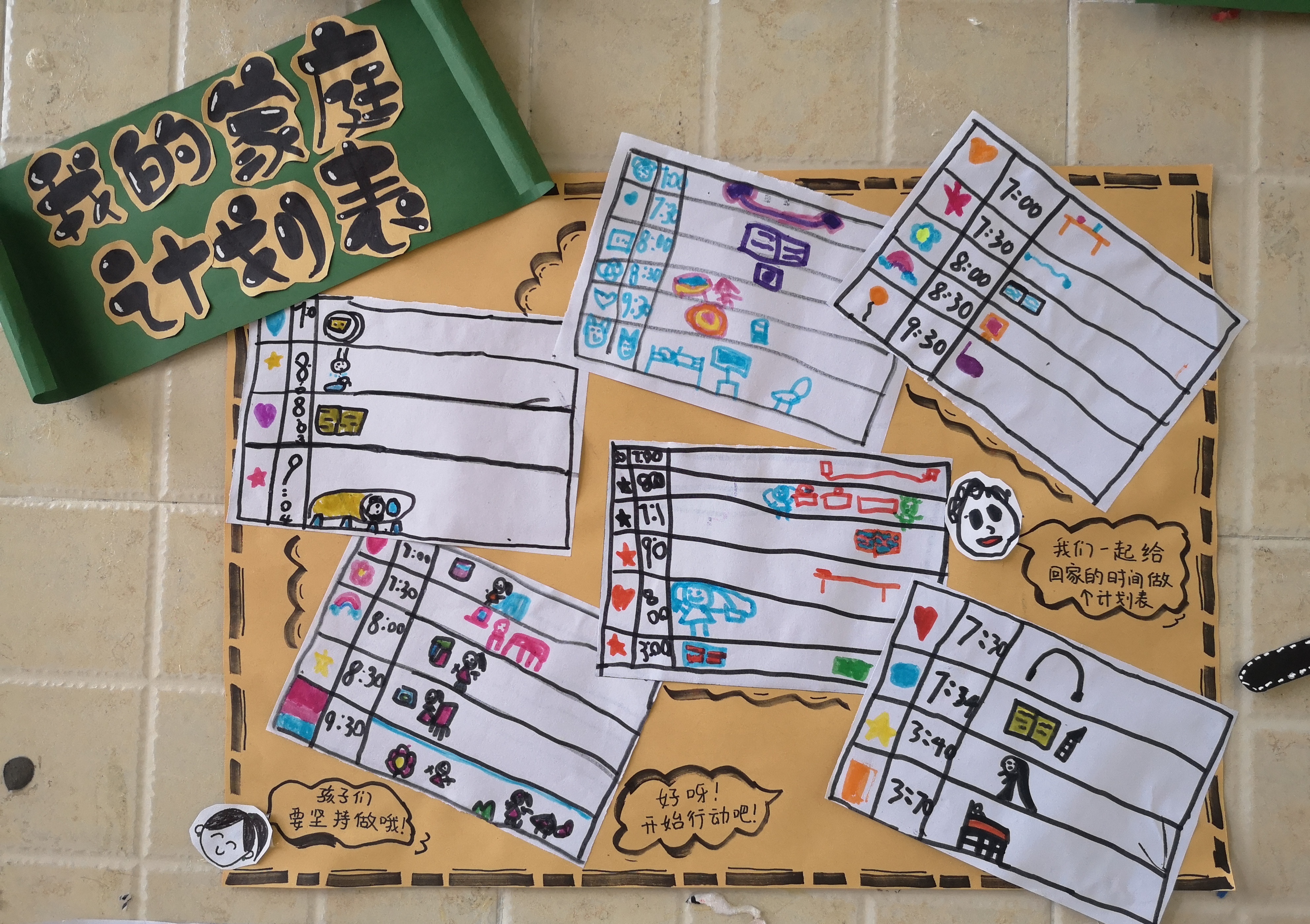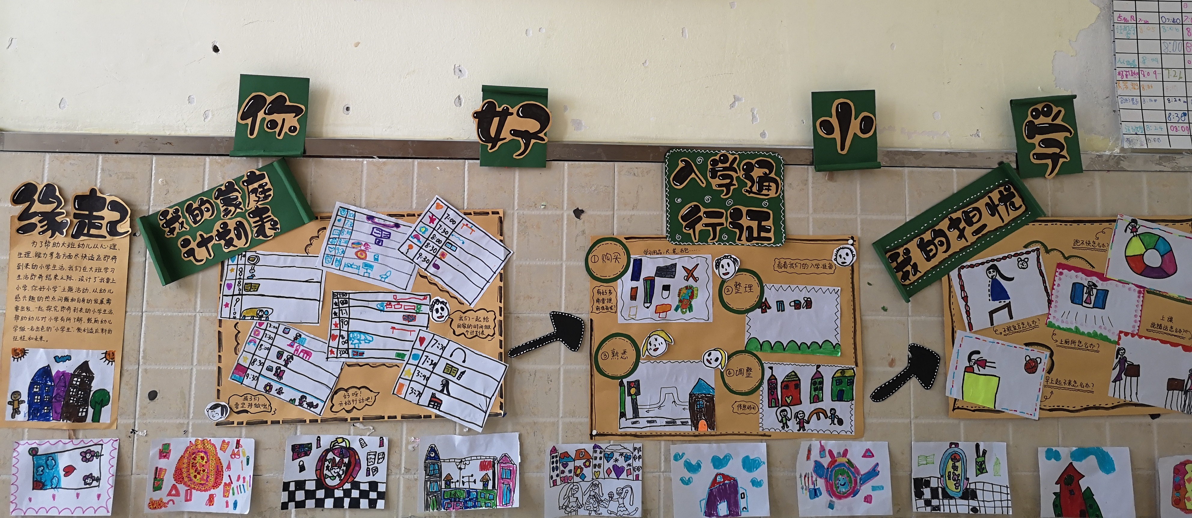 你好,小学! 第一次端坐在教室的你, 孩子们马上就要上小学了,心情会怎样?有没有担心的事情?如果你感到很担心,请将你担心的事情画下来,如:迟到了怎么办,怎么上厕所等,鼓励幼儿大胆说出自己的顾虑,请幼儿分别说说自己担忧的理由。告诉幼儿消除“担心”的办法,请幼儿用完整的语言讲述解决问题的好方法。在班级播放小学老师独白视频,进一步化解幼儿的担忧。 让幼儿自己制定一张“家庭计划表”,合理的安排自己在家的时间,为上小学做好准备。 幼小衔接并非一蹴而就,这是一个由内到外的双重适应过程,我们研究并追随孩子的心理发展需求,有节奏、有层次、有步调地,开展丰富多彩的“幼小衔接”系列活动,帮助孩子卸下对小学的不安和顾虑,逐步攻破幼小衔接的难关,在不急不缓的步调中,让孩子实现幼儿园与小学的顺利过渡,我们和小学的故事,还在继续......