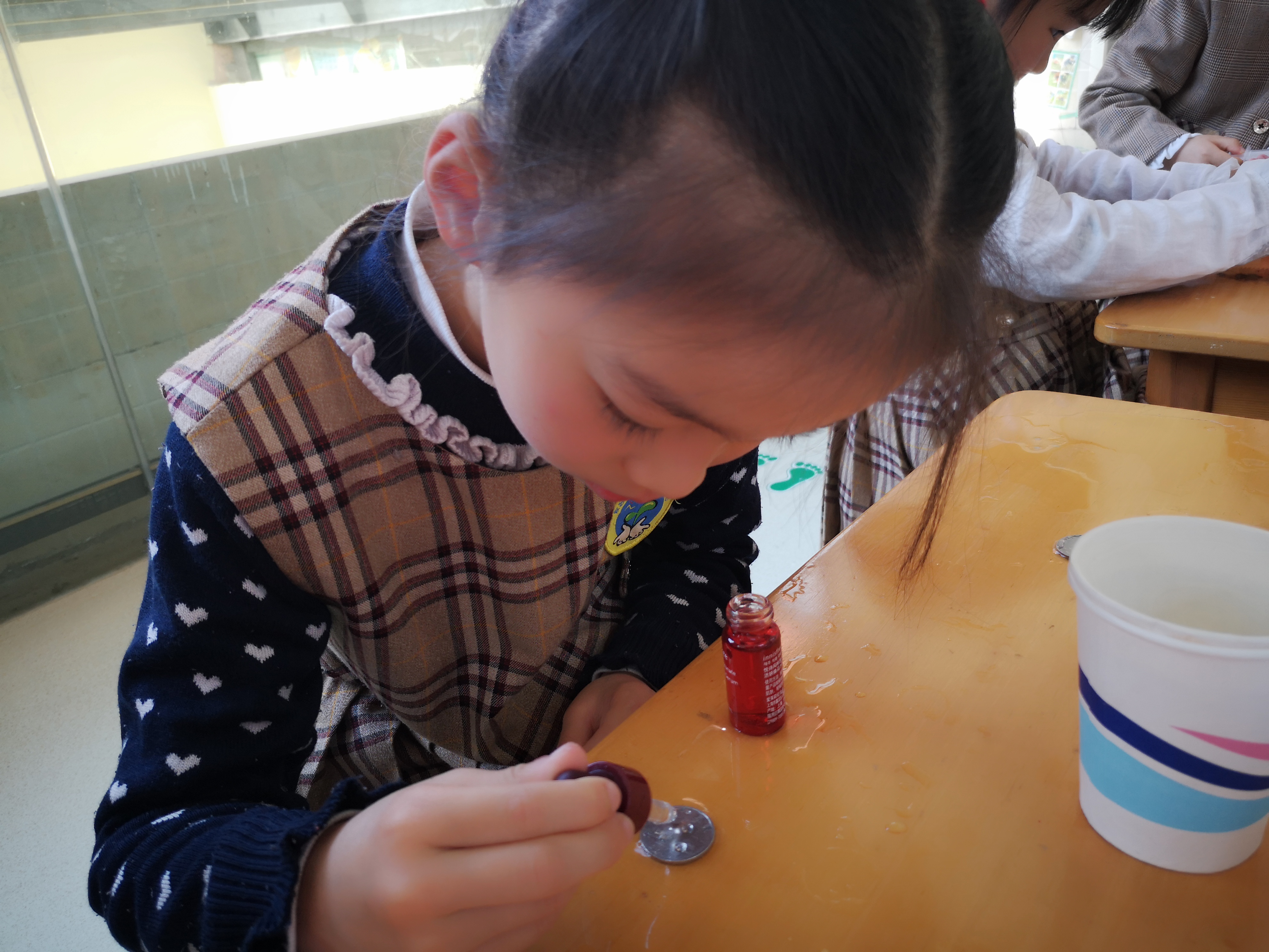 游戏名称:硬币存水(科学区) 游戏目标: 1、在老师的指导下,学习做硬币存水的游戏。 2、在游戏中培养观察和发现能力。 游戏材料:吸管、水、硬币 游戏玩法: 一个硬币,如果用滴管滴水到表面上,大家猜猜要用多少次才可以填充满整个硬币?5次?10次?15次?都不对,大家一起来看看下面的这个实验吧! 把滴管吸满水,一滴滴把水滴到硬币表面(没有滴管可用牙签、纸巾等代替,能把水滴到硬币表面即可) 太让人惊讶了,看,小小的硬币居然承载20滴水,而且旁边还有空余的位置!