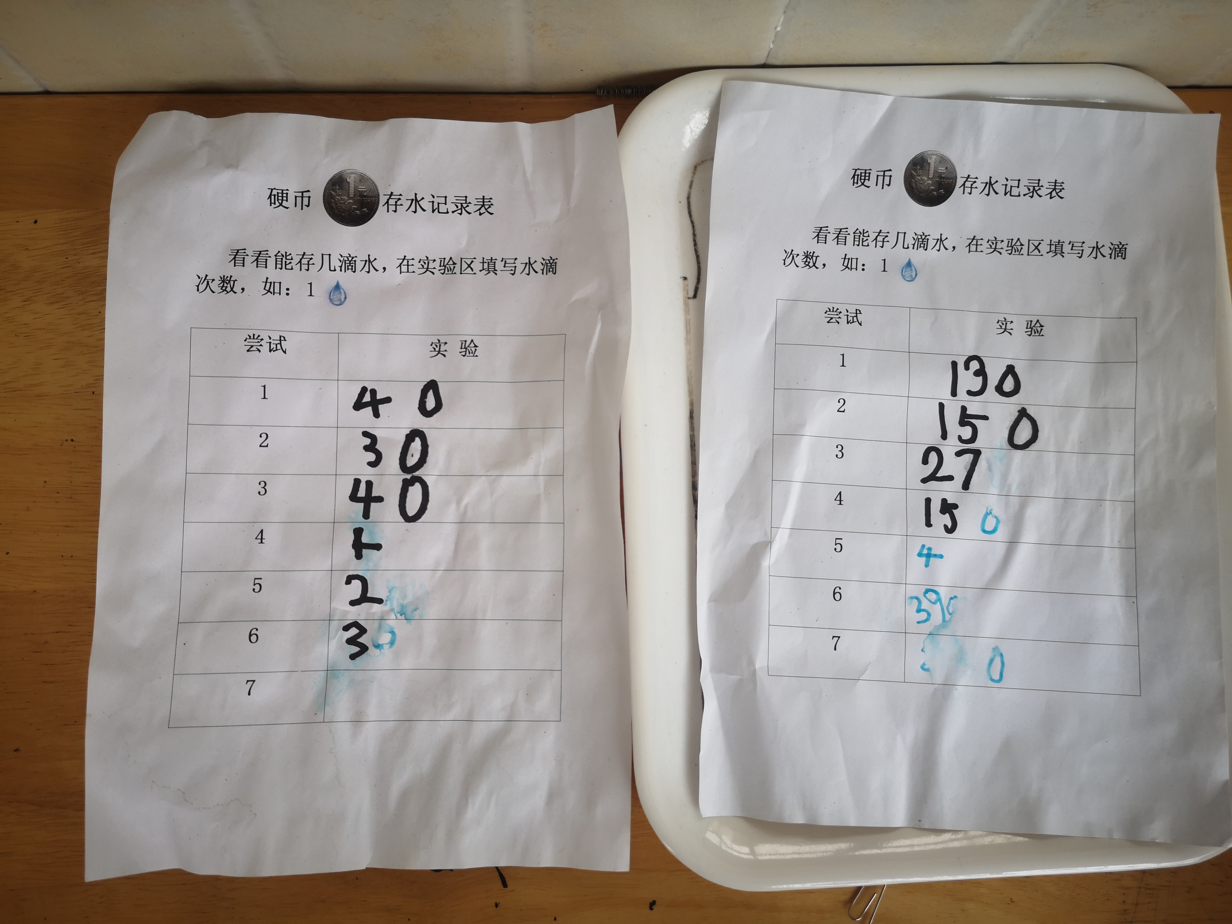 反思与调整: 你们知道这是什么原理吗?这可不是什么魔术或者特殊道具噢!而是水的张力。还有就是在滴水的过程中想一想,有什么因素会影响滴水的数量呢?(距离、速度、角度……)硬币能封存这么多的水,不是硬币的功劳,而是凭借了水的涨力特性:液体表面分子外部和内部的分子密度不同导致受力不同,形成了一个向内的作用力,这个向内的力量支撑着水不外溢。 举一反三:试试,你每一次都能装下同样多的水吗?不一样大小的钱币装的水有什么区别?如果,换成盐水、糖水等不同的水结果一样吗?
